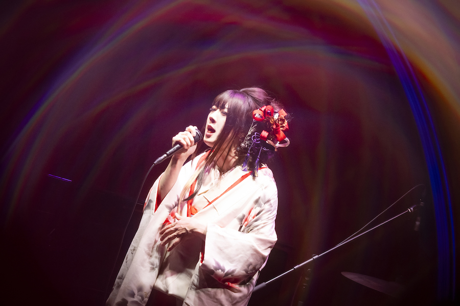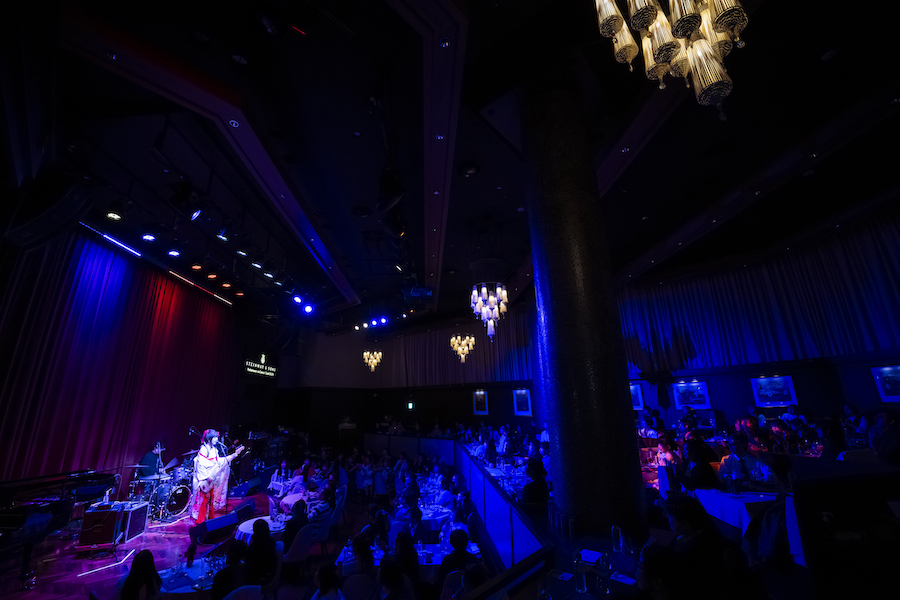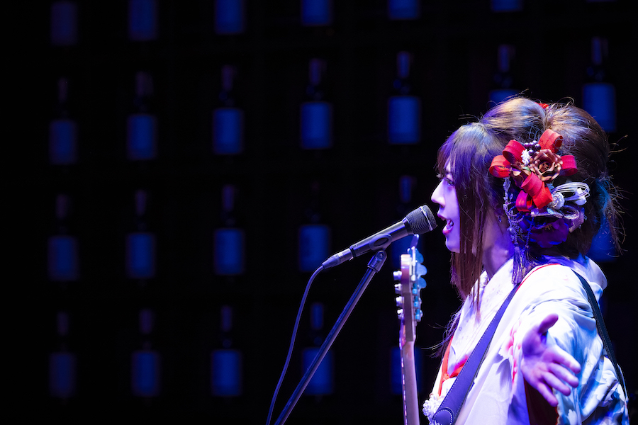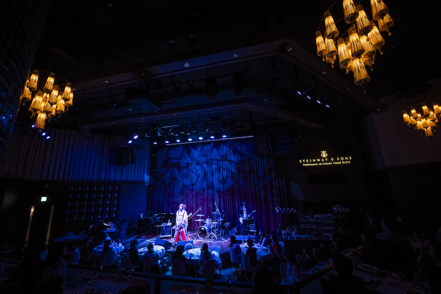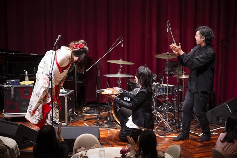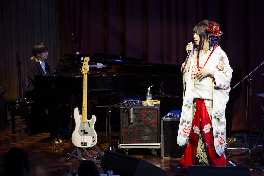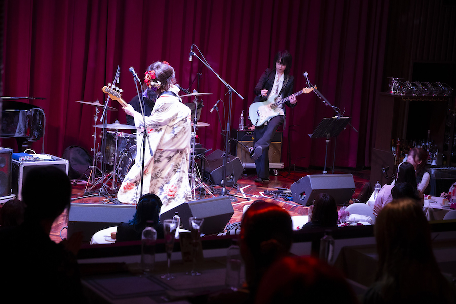ディナーが終盤に近づいたころ、静かに山葉隼也(Pf)がピアノで美しい旋律を奏で始める。ムードたっぷりの中、広末慧(G)、大野陸(Dr)、そして白い花魁衣装に赤い花のかんざしをつけた美しい装いの亜沙が静かにイン。そして「心象スノーホワイト」が始まる。《雪のような恋でした》と、透明感あるメロディーに乗せて描かれる切ない恋物語。この季節にぴったりの選曲で、ショーがスタートした。
