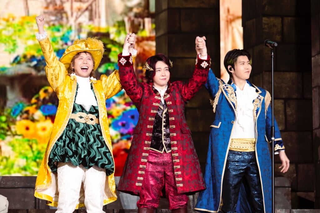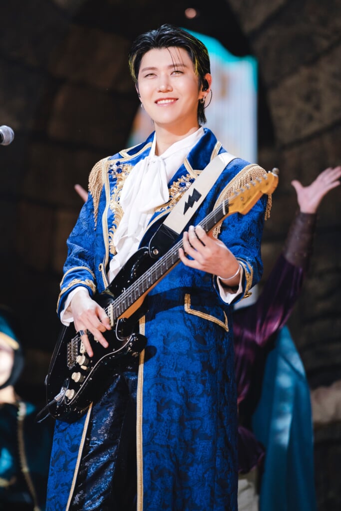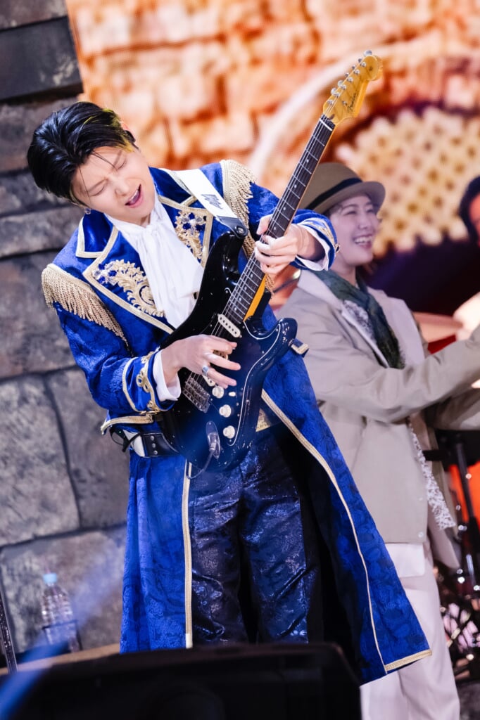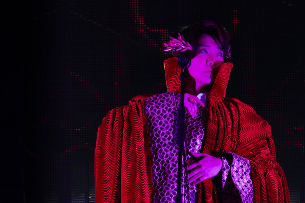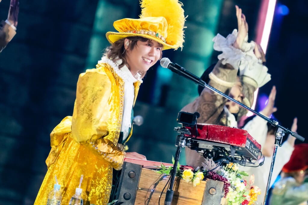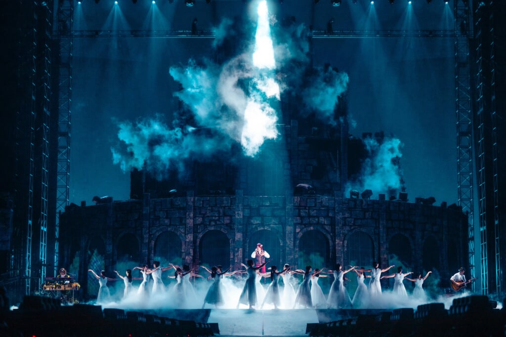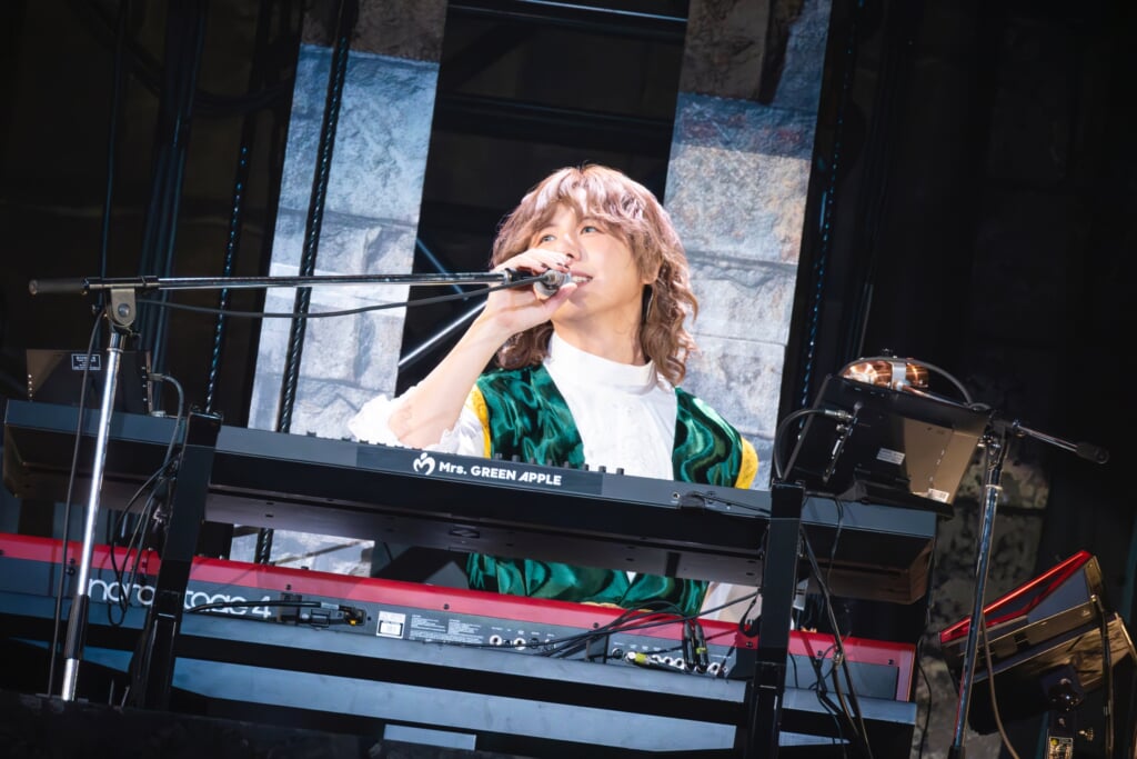 ここでサポートメンバーに目をやると、夏に行われた野外ライブ<FJORD>やフェスでもお馴染みの神田リョウ(Dr)、二家本亮介(E.B, A.B)、兼松衆(Key, G)に加え、今回は、須原杏(Vn)、小西遼(Sax, Fl, Key)、ぬましょう(Perc)も参加。後述の3人も、2024年秋の神奈川・Kアリーナ横浜にて行った定期公演<Mrs. GREEN APPLE on “Harmony”>やスタジオライブ企画<Studio Session Live>に出演したMrs. GREEN APPLEとは気心知れたミュージシャンたち。このように、<フェーズ2>の活動を通して互いを高め合った音楽仲間たちによって<BABEL no TOH>のアンサンブルは支えられており、これもまた「フェーズ2」の締め括りに相応しい豪華なバンド編成だ。加えて言えば、ステージと客席通路で大勢のキャストがパフォーマンスする様子は、音楽劇<The White Lounge>の発展形。これらも含めて<BABEL no TOH>は、「フェーズ2」でのさまざまな挑戦がいろいろな形で活かされ、そして実現できたツアーだと言えるだろう。
