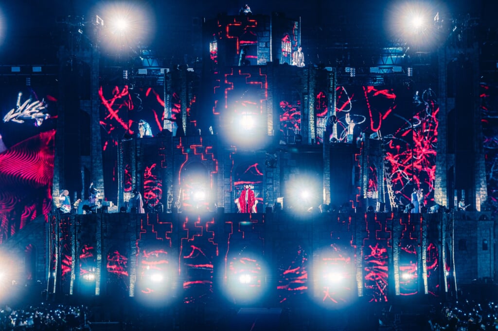 その後も5万人の大観衆が塔を取り囲む状況で、Mrs. GREEN APPLEは“ダークサイド”の名曲を怒涛の勢いで連投していく。突き抜けるようなシンセとクレイジーなギター、そしてツーバスが激しく轟く中で“和”な琴の音色が不思議な光を放つ「Ke-Mo Sah-Bee」、重厚なドラム&ベースと緊迫感を煽るバイオリンの6連符によるイントロが加えられた「ア・プリオリ」では、大森の歌に藤澤のボコーダーコーラスが重ねられたり、中間部では不協和音のオルガンが狂気を増強させていた。そして“闇の金字塔”と言うべき「Loneliness」は、圧巻のひと言。叫ぶようなアルトサックスが鳴り響くと共にレーザー光線が炸裂し、若井のギターソロも感情を爆発させる。曲の後半、藤澤が弾くパイプオルガンの重低音が塔を揺るがし、そして大森は、激情的に絶叫するかと思えば、オペラのように低音の歌声を響かせると、遂に塔は崩壊してしまった。