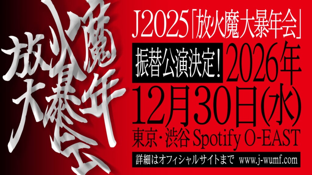 なお、延期となっていた年末恒例イベント<J 2025放火魔大暴年会>は、丸1年後の2026年12月30日に渋谷Spotify O-EASTにて振替開催することも決定した。