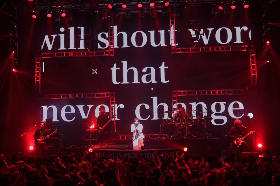 この夜に披露された全24曲中6曲は、2024年11月にリリースされた現時点での最新アルバム『CROSS』収録曲だが、この作品自体が、歌詞のモチーフはさまざまあれど、現実世界でもKIRITOに関わる複数の世界線が交差することを示唆するものであった。そして3作品それぞれから胸を打つ楽曲が並んだ中盤ブロックのストーリーは、まさに彼の生き様そのもの。「Storyteller」での“始まる世界に必ず君がいて 結末まで目を背けずにいる”、「瓦礫の花」での“君を守る光になろう”の一節で、KIRITOがフロアをぐるりと指したシーンも忘れがたい。