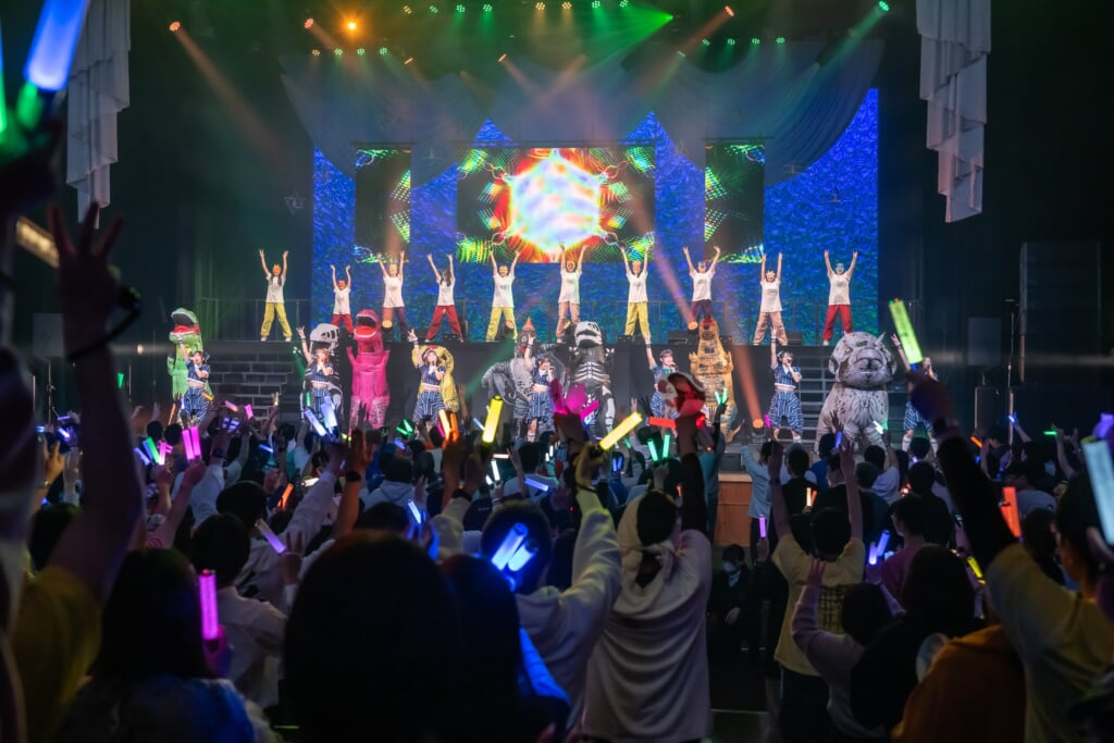 ライブは後半戦に突入。メジャーデビュー曲「クロネッカーの青春の彩り」では、メンバーの熱量に負けじと、ファンも一人一人が最大限のコールでエネルギーをぶつけ、パーティーチューン「古今東西感謝祭」では振りコピをして、会場の一体感を増幅させていく。そして、「ジェラシック・ワールド」では、8体の恐竜がステージに現れ、メンバーと共にダンス。ワンマンライブでは恒例となった光景だが、四足歩行の“新キャラ”が登場するサプライズも。メンバーそれぞれの魂がこもった「彩叫幸福論‐さいきょうこうふくろん-」のパフォーマンスも圧巻だ。