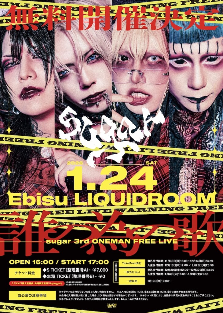 sugarが、3rdワンマンフリーライブ<誰の為の歌>を今週末1月24日に東京・恵比寿LIQUIDROOMで開催する。