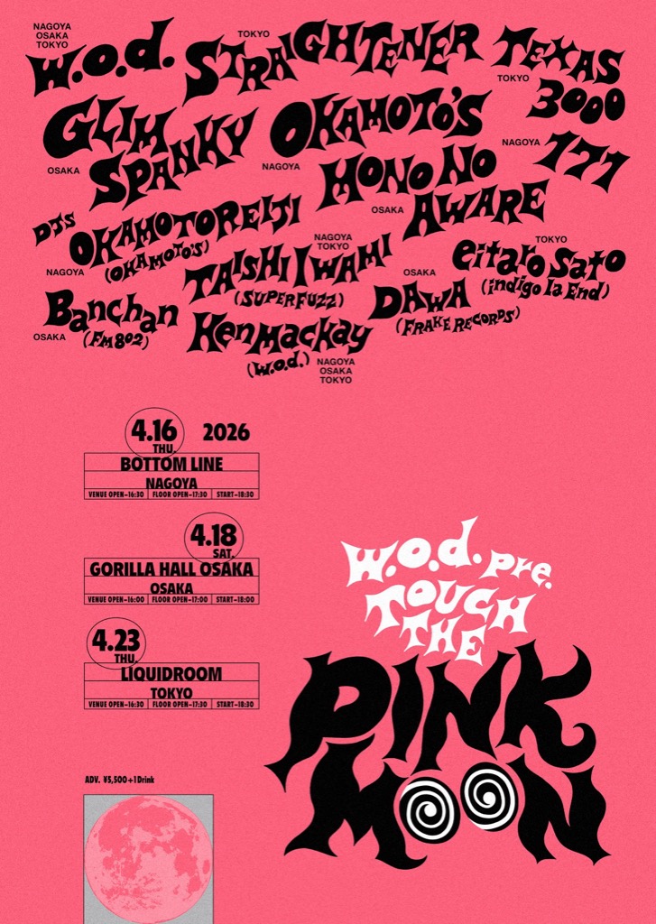 w.o.d.自主企画<TOUCH THE PINK MOON>ゲストアクトにOKAMOTO’S、GLIM SPANKY、STRAIGHTENERら