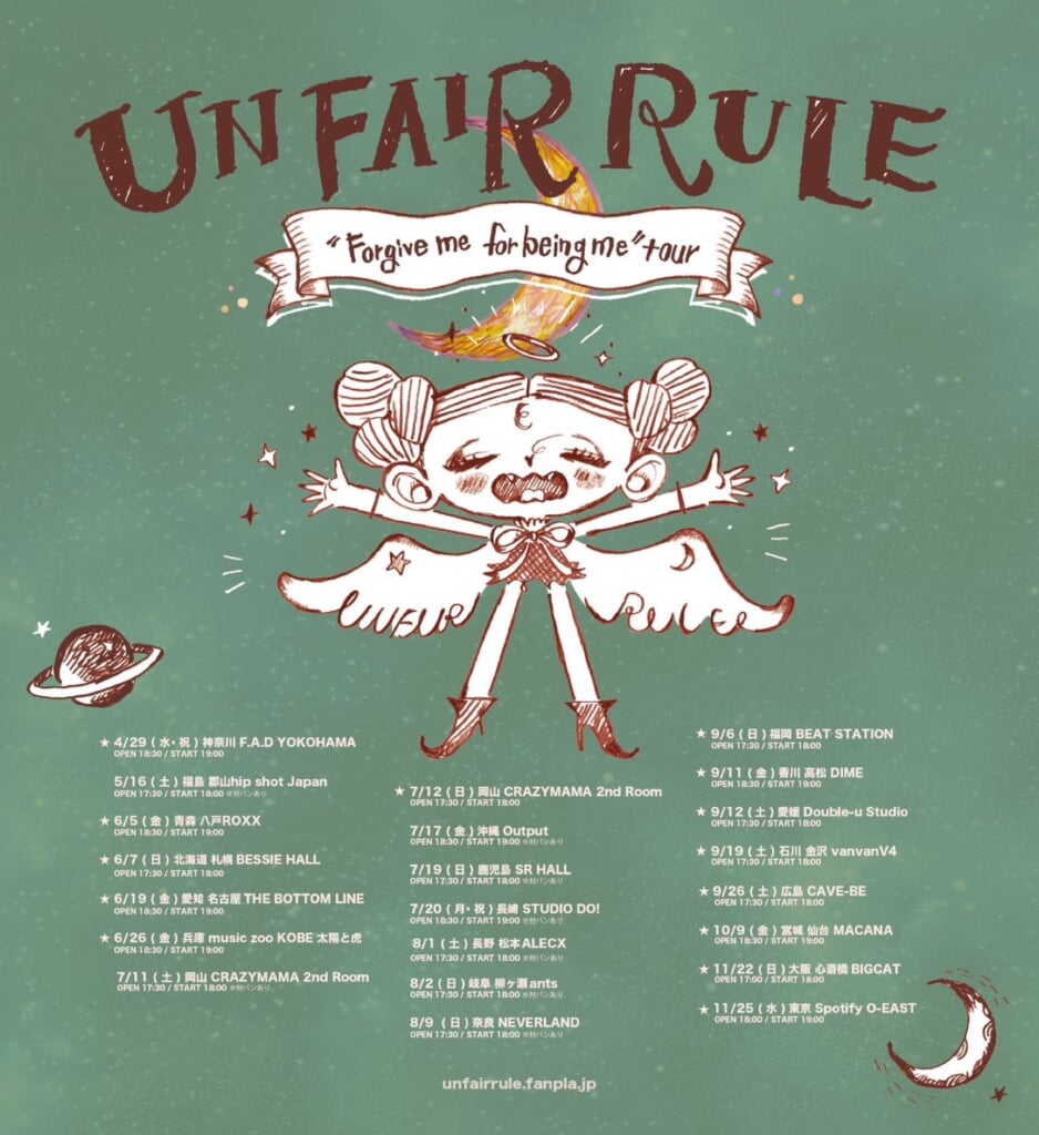このたび新たに告知された全国ツアーは<UNFAIR RULE “Forgive me for being me” tour>と題し、ワンマン/対バンを含む全22公演を開催する。神奈川・F.A.D YOKOHAMAを皮切りに、地元岡山・CRAZYMAMA 2ndRoomの2days公演ほか、11月22日の大阪・心斎橋BIGCATや11月25日の東京・Spotify O-EAST、そして北は北海道、南は沖縄までを含むUNFAIR RULEとしては最大規模の全国ツアーとなっている。チケットはオフィシャル最速先行がスタート。