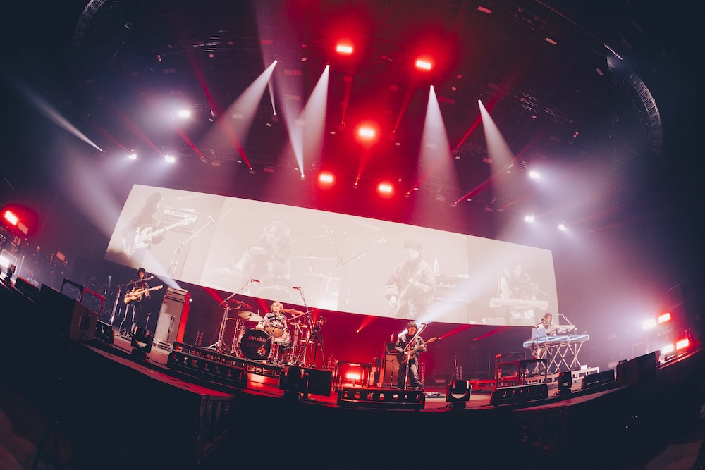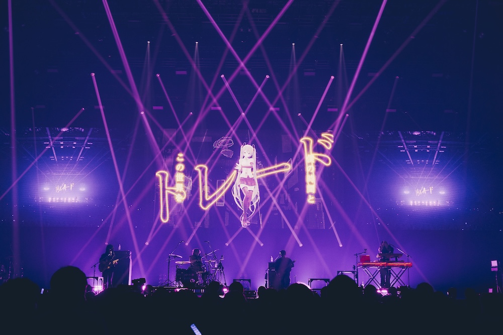重厚なSEと共に4人がステージに姿を現すと「ドリーマーズのテーマ」のセッションがスタート。syudouがドラム、ツミキがベース、Ayaseがキーボード、すりぃがギターと、4人が一列に並ぶバンド編成だ。「DREAMERS、始めるぜ!」とsyudouが告げ、まずはツミキ作曲の「アングレイデイズ」を披露。ステージ背後の巨大LEDビジョンには鏡音リンの歌唱する姿が映し出され、バーチャルな歌声と生身のバンドサウンドが混じり合う。
