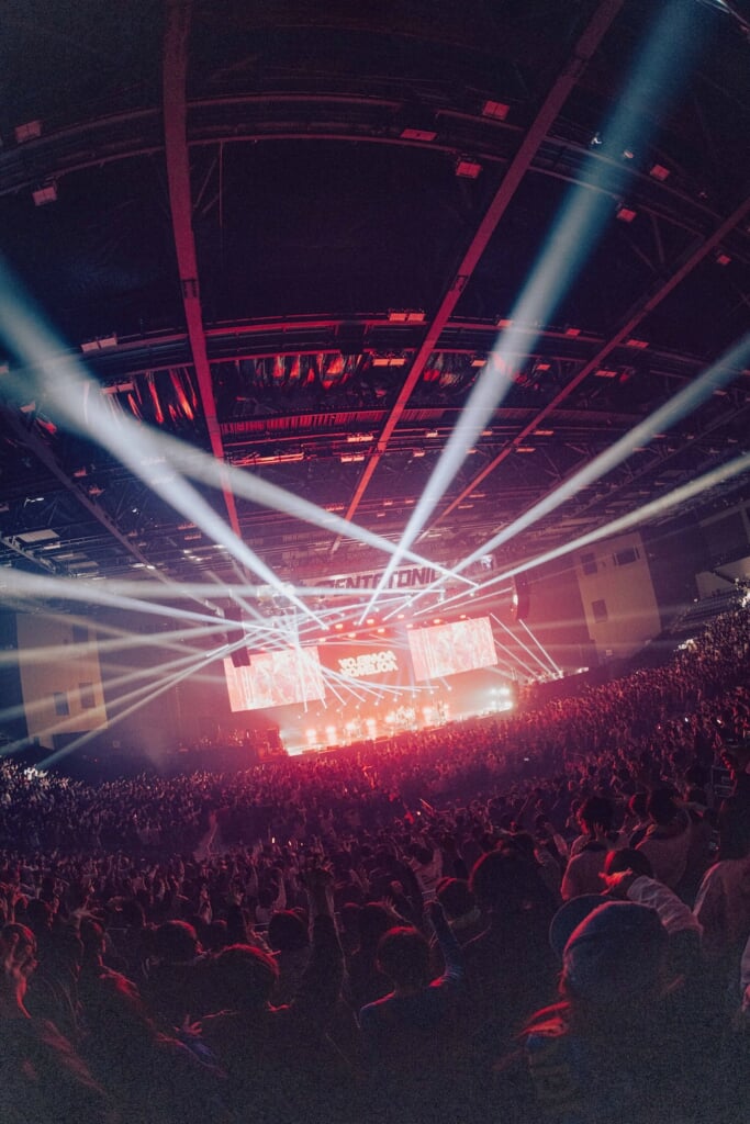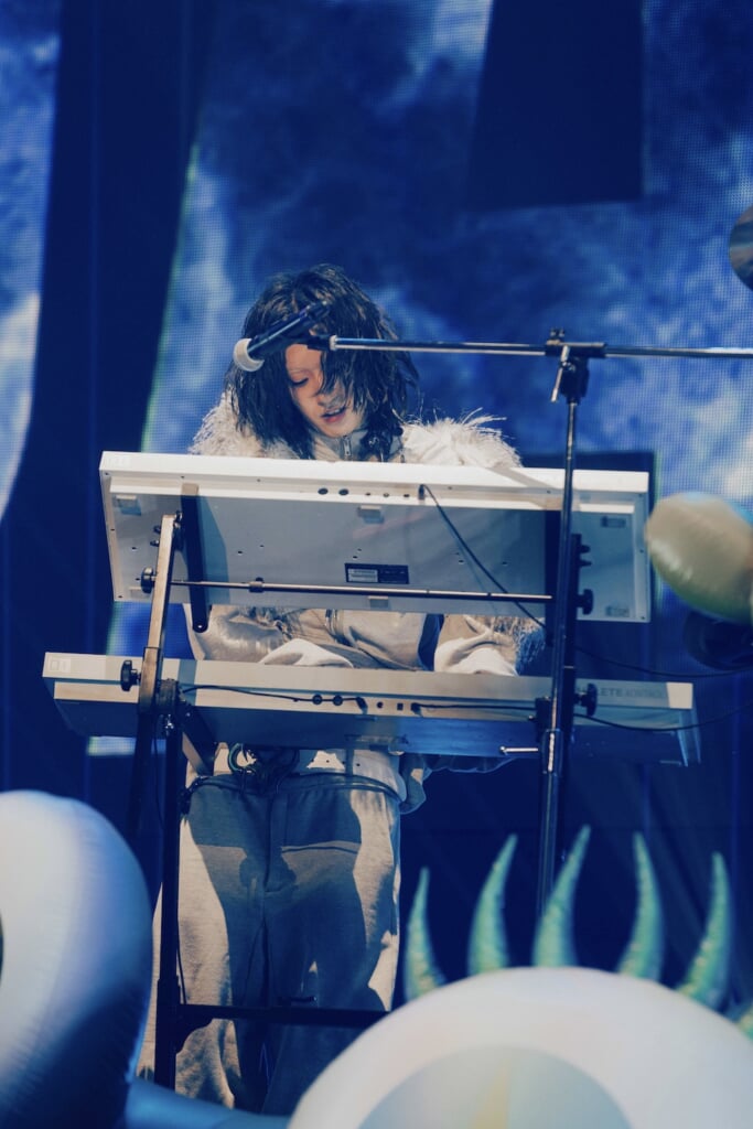 先ほどはDREAMERSの一員としてキーボードを弾いていたAyaseが、今度はYOASOBIとして登場。「ぶち上げていけますか!」というikuraの声を合図に「アイドル」が炸裂すると、フロアは沸騰。「オイ! オイ!」のコールが飛び交う中、続けざまに「祝福」、「UNDEAD」とハイテンションなキラーチューンを連射。冒頭からトップスピードで駆け抜け、会場のボルテージを天井知らずに引き上げていく。