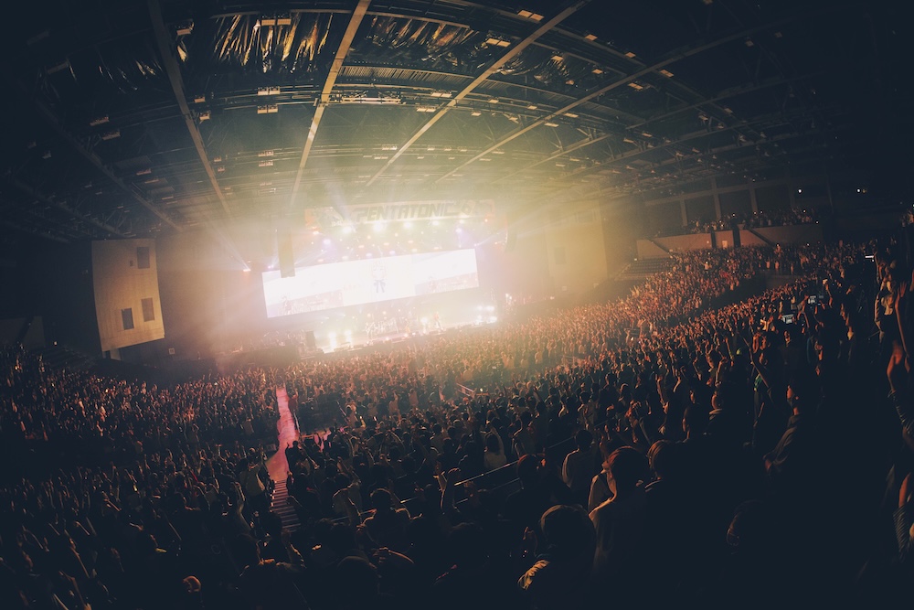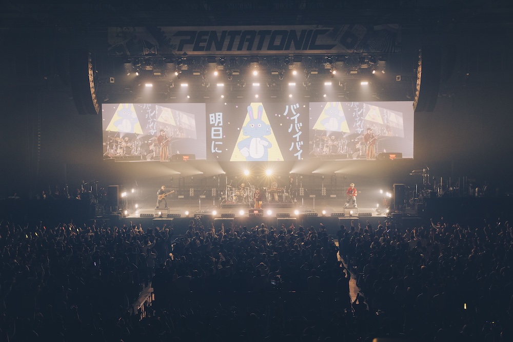 「今日は一日楽しんでいきましょう!」と告げたすりぃ作曲による、鏡音レンが歌う「テレキャスタービーボーイ」へ。疾走感あふれるダンスロックにフロアが沸き立つ。ラストの「ビターチョコデコレーション」ではパワフルなバンドサウンドの上で初音ミクがダークでシニカルなメロディを歌う。演奏を終え、4人は肩を組んでステージ中央へ。「それではPENTATONIC始まります!」と高らかに宣言し、オープニングアクトとしての役割を完璧に全うしてバトンを繋いだ。
