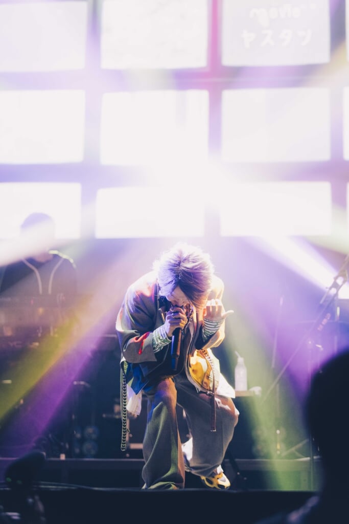 MCでは「彼は見ての通りものすごいエネルギーに溢れた人間で、全てに全力投球。やると言ったことは必ずやる」と主催者であるsyudouへの熱い信頼を口にし、「このイベントも5~6年前から言ってたこと。僕もほんまに嬉しいです」と感慨深げな表情を見せる。「特別な一日になると思うんで、全力で楽しんでください」と告げると、ハンドマイクで「限りなく灰色へ」を歌い上げた。「ジャンキーナイトタウンオーケストラ」では手拍子が自然と湧き起こり、「救ってくれない」では何度も客席を煽りながらテンションを高めていく。