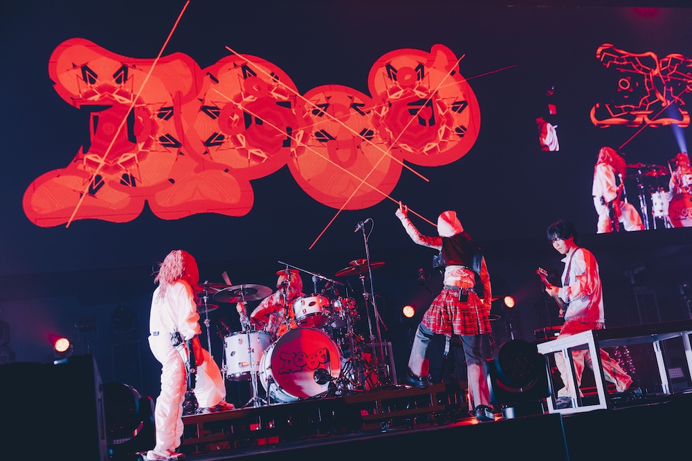 1曲目は「ノックブーツ」。谷絹はステージを歩き回り、時に腰掛けながら妖艶なハイトーンボイスを響かせる。目が離せない存在感だ。続く「サクラループ」ではKtjmがテクニカルなギターソロを炸裂させ、フロアの熱量を一気に高めていく。オーディエンスのほぼ全員が手を上げて身体を揺らす「るてん」で会場が一体となると、「騒げますか!?」という谷絹のコールに応えて盛大なシンガロングが巻き起こった「冥冥」へ。四つ打ちのビートがフロアを包み込み、心地よい高揚感が満ちていく。