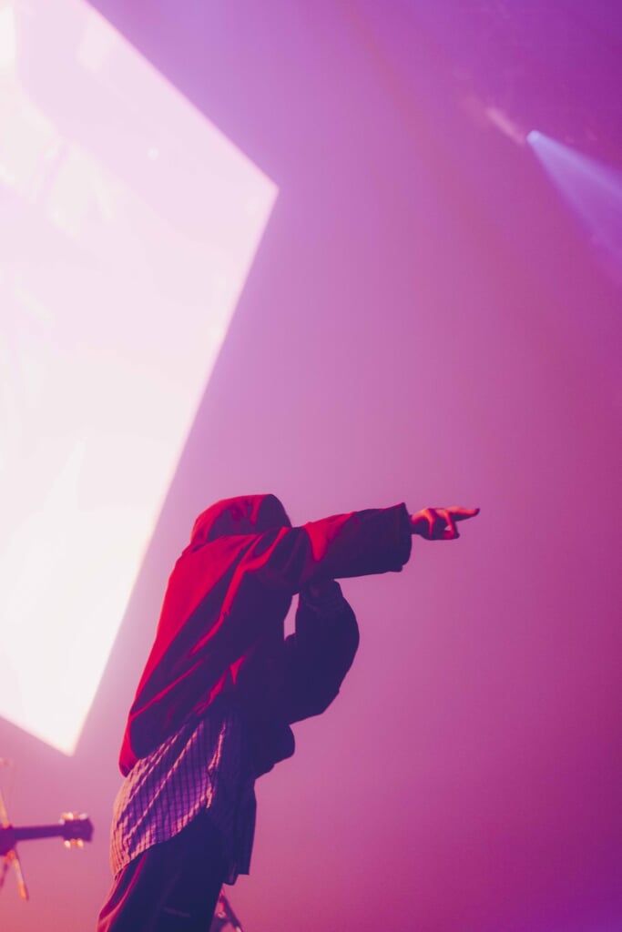 そして2日間のラストを飾るのは主催者、syudouだ。大歓声に迎えられてステージに現れると、「大トリsyudou、始めます!」と宣言し、「神頼み」からライブをスタートさせた。バンドメンバーはKuboty(G)、ホリエマム(Dr)、長島涼平(B)、モチヅキヤスノリ(Key)という初ライブから不動の布陣。モチヅキは須田景凪、なとりに続いて3ステージ連続の出演だ。「インザバックルーム」ではsyudouはステージの端に腰掛けたりお立ち台に上がったりと縦横無尽に動き回りながら歌い、フロアを熱狂の渦に巻き込んでいく。