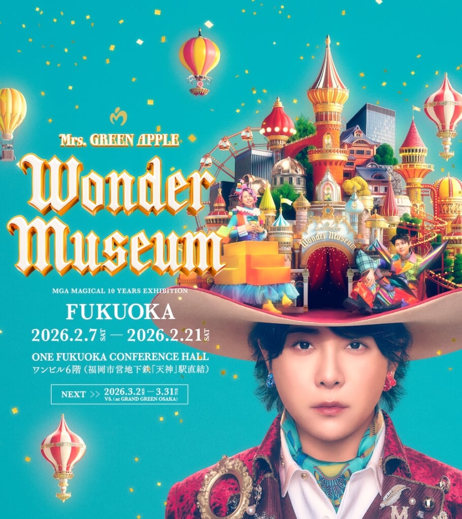 Mrs. GREEN APPLEが、デビュー10周年を締めくくる企画となる展覧会「MGA MAGICAL 10 YEARS EXHIBITION『Wonder Museum』」が2026年1月に東京会場での開催を終え、2月7日より、福岡会場での展示がスタートする。
