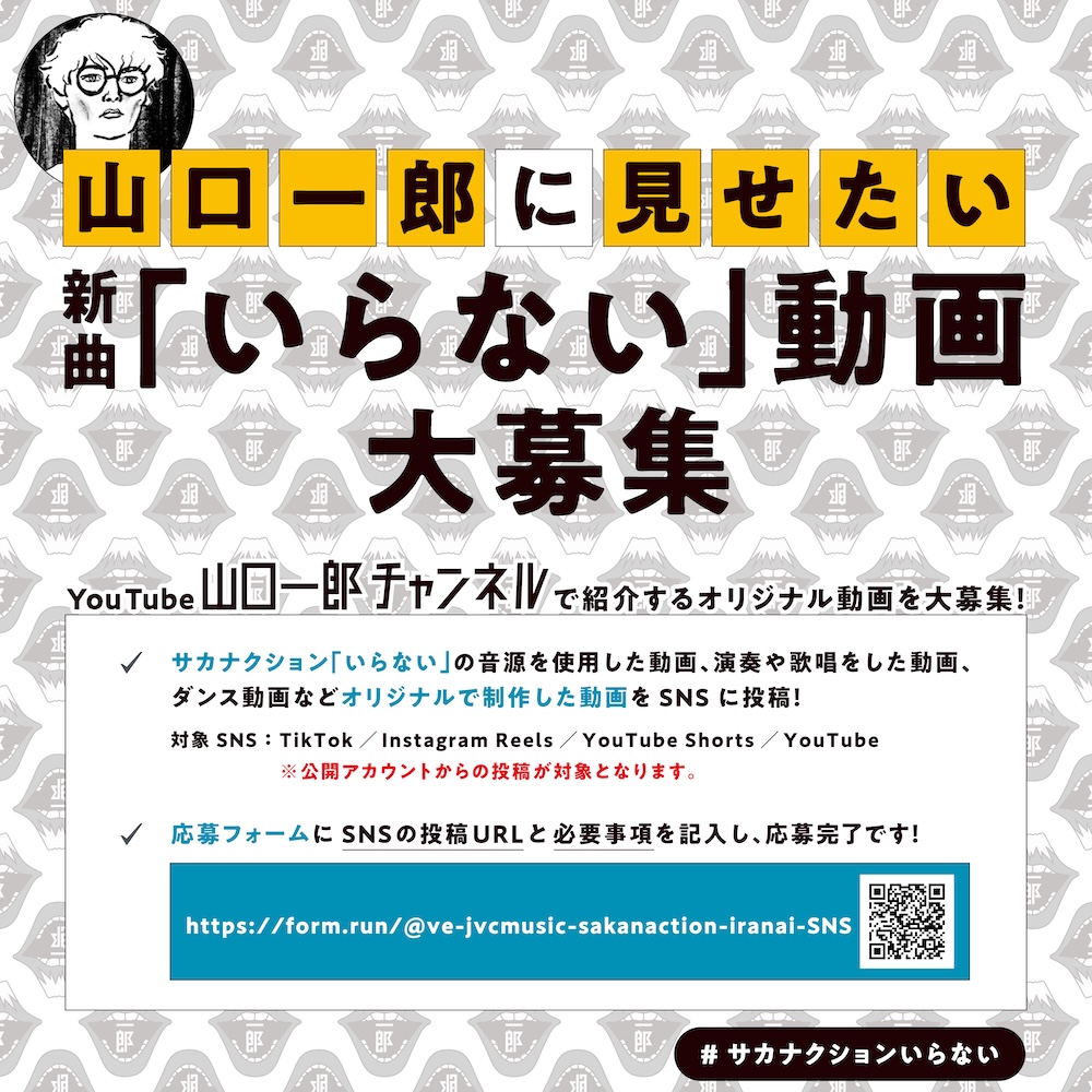 さらに、「いらない」の演奏動画・歌唱動画や踊ってみた動画など、SNSにアップロードした動画を募集する企画、『山口一郎に見せたい新曲「いらない」動画大募集』がスタートした。ユーザーが投稿したSNS動画が山口一郎YouTubeチャンネルにて紹介される可能性があるとのことで、応募フォームより指定の情報を記入して、ぜひ参加いただきたい。