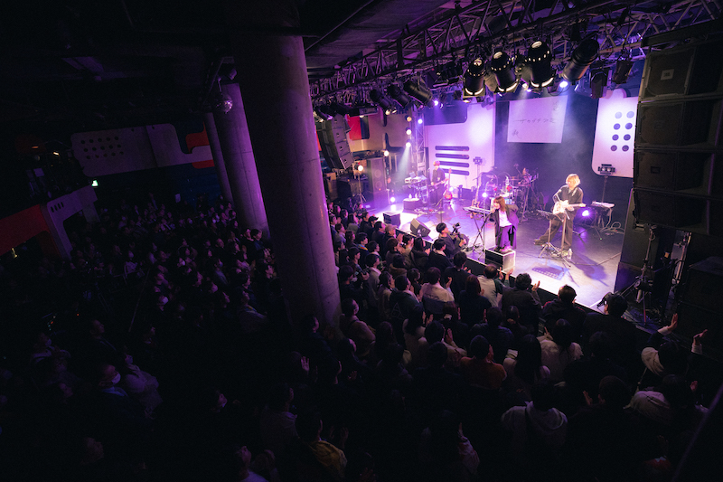 二番手はバンド内最年長、ベースのマサくんこと齋藤太陽(まさあき)。トークでは「サイコォウ!」という口癖を真似して笑わせつつ、一転して歌はどこまでも切なく愛しく美しく。曲は「サイレント」。鍵盤を弾きながら歌うボーカルに、もう一つの声のように寄り添うベースが優しい。最後は唯一の年下メンバー、ギターの西尾瞭(りょう)を迎え入れ、「好きな県は?」「大阪」「そんなメジャーなところじゃなくて」「じゃあ群馬」と、謎の質問コーナーを経て(群馬から来た人にピックをプレゼント、というオチ)、未音源化曲「サニーサンデー」を初披露。恋の喜びを照れながらもまっすぐに歌う、心あたたまるラブソング。嬉しいのになぜか戸惑いがにじむような、サビのメロディが秀逸。ライブの人気曲になりそうだ。