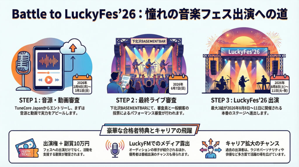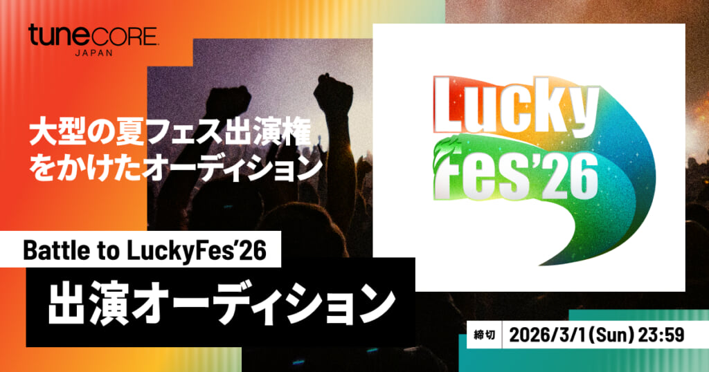 TuneCore Japanと<LuckyFes>とのコラボによる「Battle to LuckyFes’26」は、TuneCore Japanのオーディション受付ページからエントリーを募り、音源・動画審査を経て最終ライブ審査を通し、<LuckyFes’26>のステージ出演権が最大3組に授与されるというもの。副賞として10万円も贈呈される。