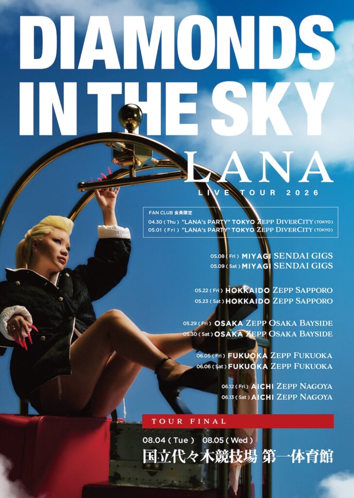 さらに、LANAは2026年に<LIVE TOUR 2026「DIAMONDS IN THE SKY」>を実施予定。4月末から始まる同ツアーは、東京(Zepp DiverCity)を皮切りに、全国6カ所のZepp及びZepp級キャパシティの会場で全公演2日間ずつ開催され、ファイナル公演は東京・国立代々木競技場 第一体育館で、他会場と同じく2デイズで実施される。なお、東京・Zepp DiverCityでの初回公演はファンクラブ会員限定のスペシャルライブとなることも発表されている。