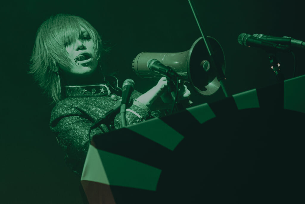 師走の忙しい時期、平日の金曜日に満員となったCLUB CITT’Aは壮観だった。R指定が活動するうえで大事にしている“ライヴ”、今回は「独裁」から幕を開けた。驚いたのは、パフォーマンスにおける演出だ。ステージ後方に組まれた演説台、およそ3mの高さはあっただろうか。そこからマモ(Vo)がフロアに向かって拡声器を使って歌うところは、もはや一国の王のようであり、曲が進むほどに観客をアジテートしていく。彼の発言は解凍時のライヴよりも説得力を増しており、ここで表現された凄まじい迫力は楽器隊にも良い影響を与えていたように思う。