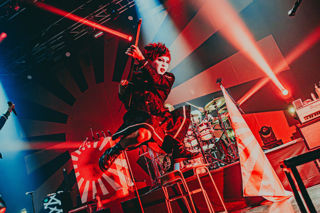 さて、演出面で特筆することが今回のライヴでは多々あったのだが、炎が曲を盛り上げるのに一役買っていたこともお伝えしたい。パチパチメラメラという熱さを表現する音が聞こえてきそうなほど燃え上がった炎をバックに、暗がりのステージの中でメンバーのシルエットだけが浮かび上がった「心中日和」は見事な出来栄えだった。演奏力あるR指定だからこそ、こうした演出でも魅せることができるのだろう。そこからすぐにつなげた「神風」では、宏崇(Dr)のスパークするドラミングに相まって地を這うような低音で曲を盛り上げた七星(B)のベースラインがとても良かった。