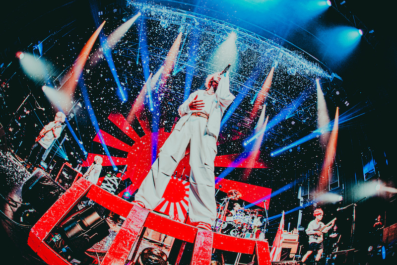 「川崎イェーイ! はい、本日は単独公演<神風>へようこそ。ご挨拶が遅れました、R指定です。アンコールですが、2025年のR指定のライヴはですね、今日で最後ということで、ちょっと今日は演説台があるので演説台で喋ります。あんまり変なこと言わないようにしなきゃ、こんなご時世すぐに燃えちゃうんで。ね、日の丸とかバックにあるし、気を付けとかないといけない(笑)。まぁ、あれっすね、日本人の血が僕らには流れてるんで。だから、日章旗を背負う権利はあると思っております」