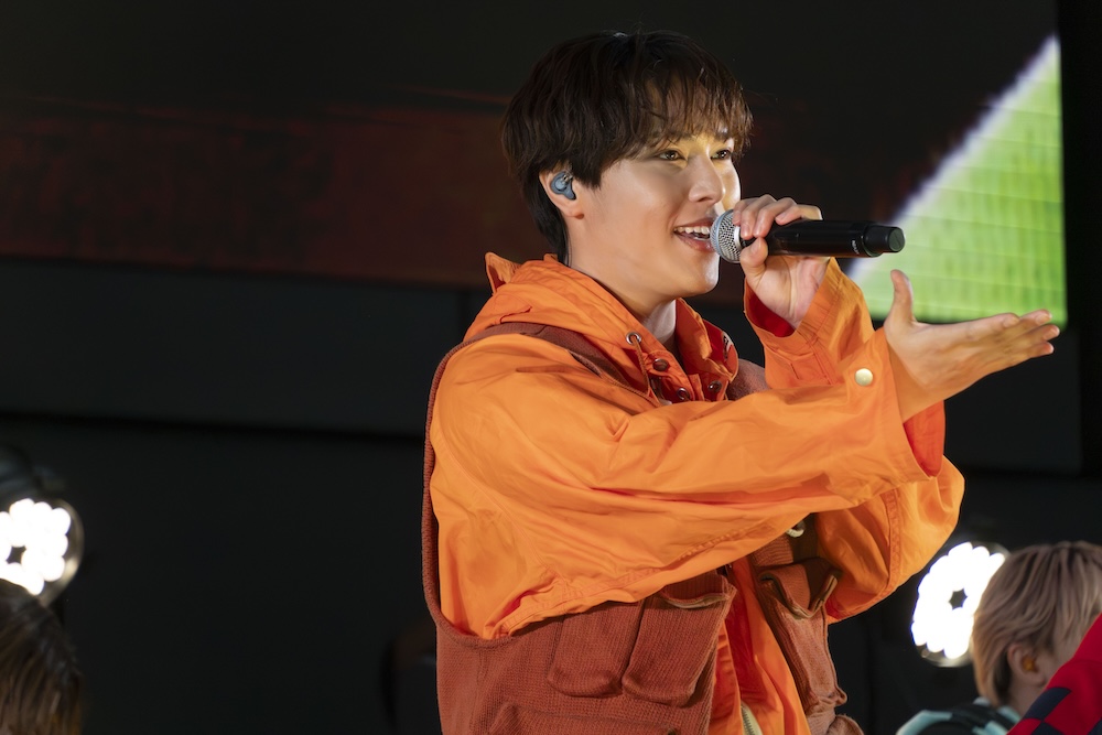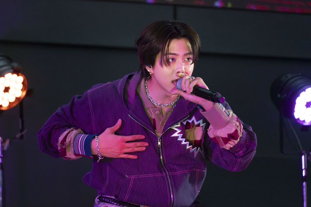 FUMIYAが「盛り上がれますか!」と煽ってからは、アルバム収録曲のうち、すでにライブで披露してきたナンバーを連投する。1曲目の「RUN」はKEVINとSHOOTが作詞を担当し、作曲にも参加した彼ら初のニュージャックスイング曲。切れ味の鋭いスキルフルなダンスで目を奪い、骨太なラップで挑発しながら、バディを光の元へと連れ出すというメッセージを堂々と放っていく。続く「Sonic」は、昨年春の初パフォーマンス以来バディが音源化を待ちわびてきたナンバー。“音速”という意味を持つタイトルの通り、疾走感あふれるサウンドと高速ラップ、そして朗々たるKEVINの歌声に牽引されたバディは、サビの力強い〈Be the light!〉のフレーズで、大きくペンライトを振りたくった。