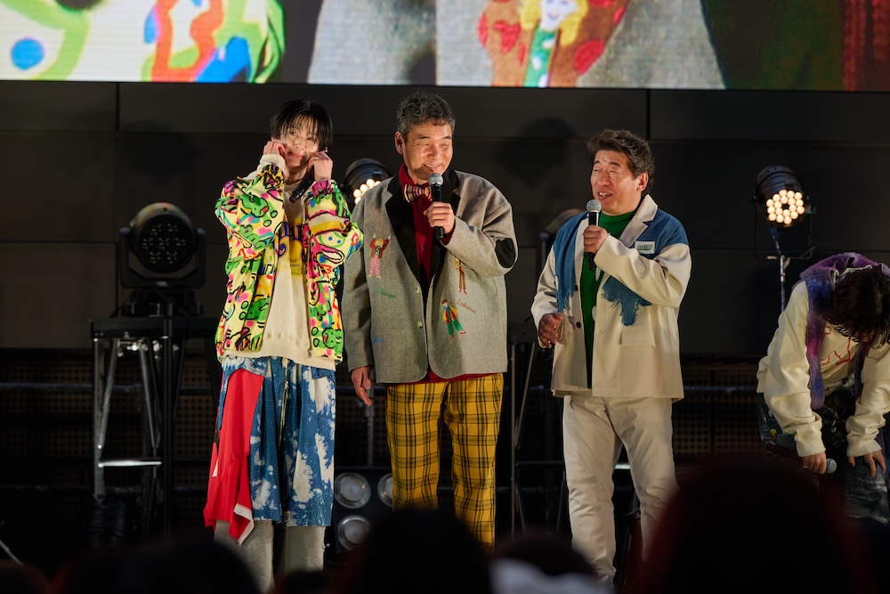 未来への期待と決意の籠もった楽曲を届け、FUMINORIがMORRIEとSHOOTを呼び込むと、なんとダチョウ倶楽部の肥後克広と寺門ジモンがステージに乱入。アルバムリード曲の「#KISSYOU」について、肥後は「ケンカしてチューという僕らのギャグを元に生まれた曲だと聞いてますよ」と語り、「『#KISSYOU』をやるならケンカしてチューをやらないといけない!」と主張してみせる。そこでメンバーは「じゃあ、俺が!」と次々に立候補し、最後にFUMINORIが「じゃ、俺やりますよ」と手をあげると、全員に「どうぞどうぞ!」と譲られる天丼芸が展開。結果「普通はやらないんです!」と固辞するFUMINORIに「ビジネスとして、エンターテイメントとして!」と肥後が迫り、「エンタメにも限界がありますよ!」と反抗しながら最後は2人でキス! 客席からは悲鳴のような歓声があがり、FUMINORIは「メチャメチャやわらかかった。なんでこんなにドキドキしてるの!?」と照れまくった。