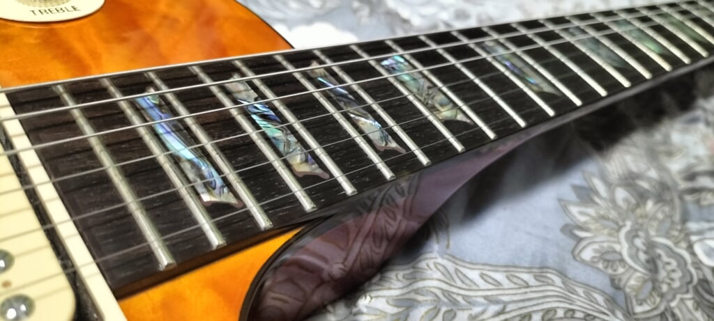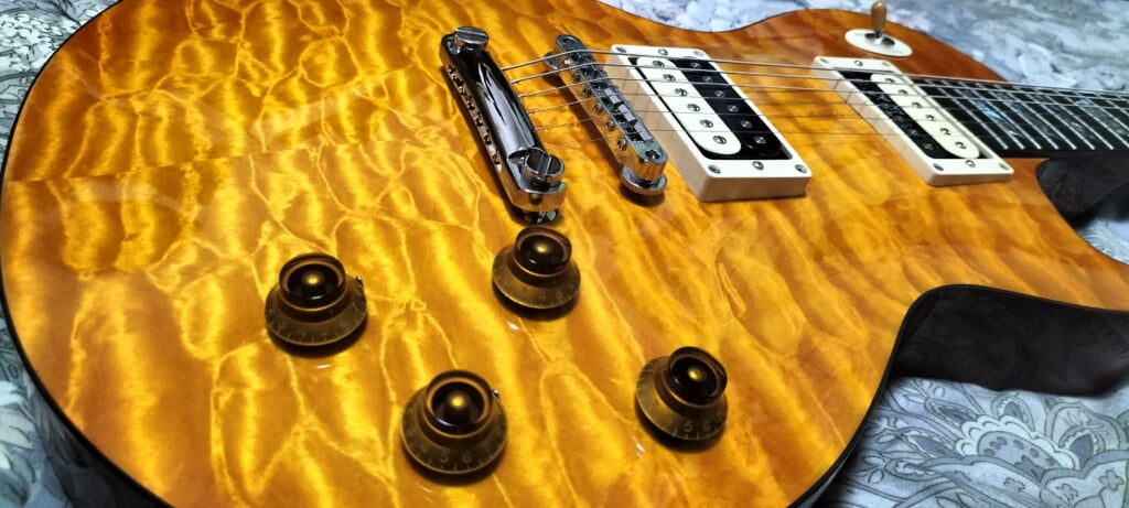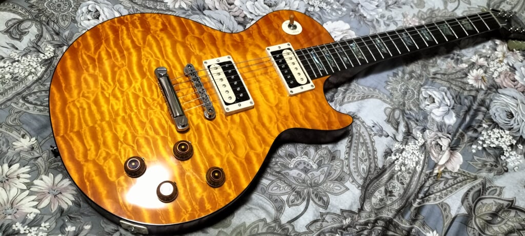 お気に入りポイントはたくさんありますが……まずは目を引くトップ材。こちら楽器屋さんのオーダー品になるのですが、モデル名の「TK」の由来通り、ぼくの推しでもある某アーティストのモデルを彷彿させるキルトメイプル。何度見ても飽きません。インレイもギラッギラのアバロンインレイで。オーダーした方はきっとかなりのファンだったのかもしれません。