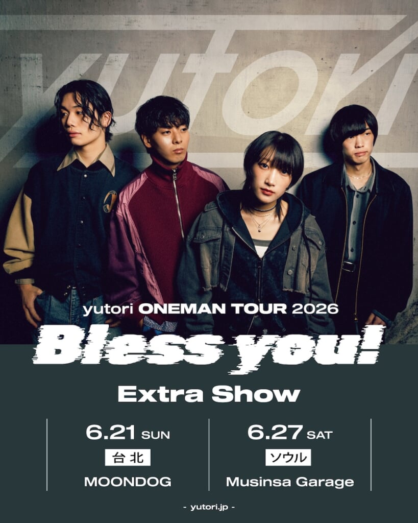さらに、3月より開催される全国ツアーのタイトルが<yutori ONEMAN TOUR 2026”Bless you!”>に決定し、追加公演として台北、ソウルでの海外公演が新たに決定した。yutoriにとって日本国外でのワンマンライブの開催は初めてとなる。チケットは日本国内からも入手可能となるため、合わせてチェックしてもらいたい。