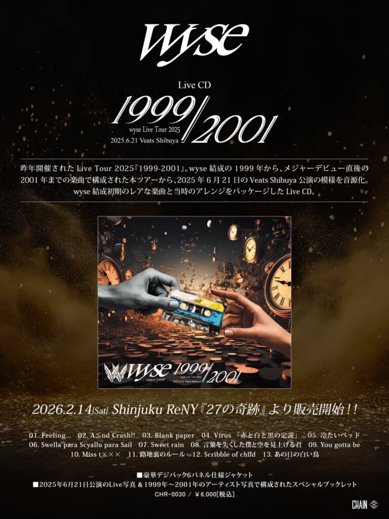 本ツアーはタイトルどおり、2002年リリースのアルバム『Calm』をテーマに行われるものだ。「wyseにとって『Calm』は大きな転機となった作品」だとは後に公開(本日2月14日20時予定)するBARKSインタビューでのメンバー発言だが、タイアップ曲も多数収録されるなど、新境地を拓いたアルバムでもある。ツアーでは、多彩な楽曲群が収録された同アルバムから、アレンジも当時のまま演奏されるとのこと。