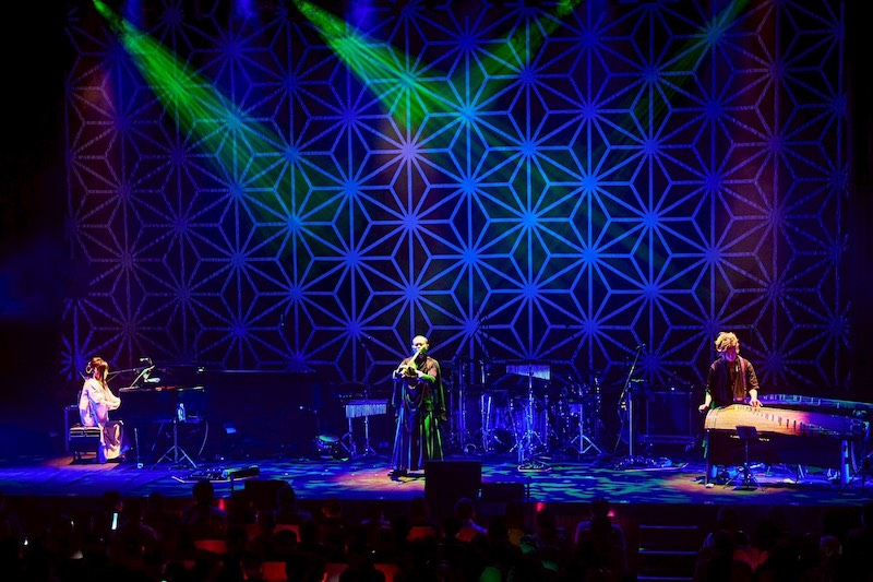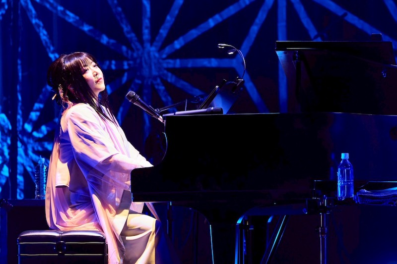 そんな和風の一面とは打って変わり、今度は鈴華がピアノを弾き華風月の3人でインスト曲「機械島」を披露。機械だらけの島がやがて朽ち果て、植物で覆われていく──そんな世界を描いたエモーショナルな一曲だ。尺八は風、箏は月にみたて華風月というユニット名になったそうだが、その名の通り、神永の尺八は島を駆け抜ける風のようで、いぶくろの箏の音は月や星の瞬きように聴こえてくる。歌がないゆえに、たっぷりと曲の情景に浸ることができ、とても素敵な時間だった。
