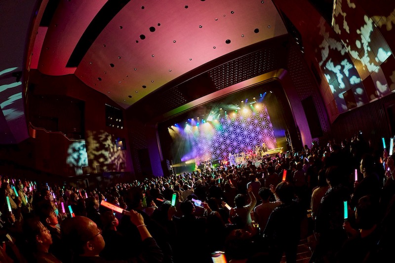 そしてここからはまた驚きの場面が。鈴華がピアノに座り、華風月の3人で童謡「通りゃんせ」が始まった──と思っていると、子どもたちを含む30名ほどの合唱団が入場。鈴華の歌にコーラスを加えていく。そのまま「朧月夜」「赤いやねの家」も歌われた。鈴華は「ずっと子どもたちとのコラボレーションがやりたくて」といい、昔自身がピアノを教えていた東京音楽大学に関連する合唱団を呼んでその夢を実現したという。華風月らしいコラボレーションだ。バンドメンバーも全員加わり、「千本桜」をこの大編成で披露。数々の場面で鈴華の歌う「千本桜」は聴いてきたが、ここまでの人数は初めてかもしれない。ファンも一緒に声を出し拳を振り、会場にはまさに大団円の盛り上がりが生まれた。