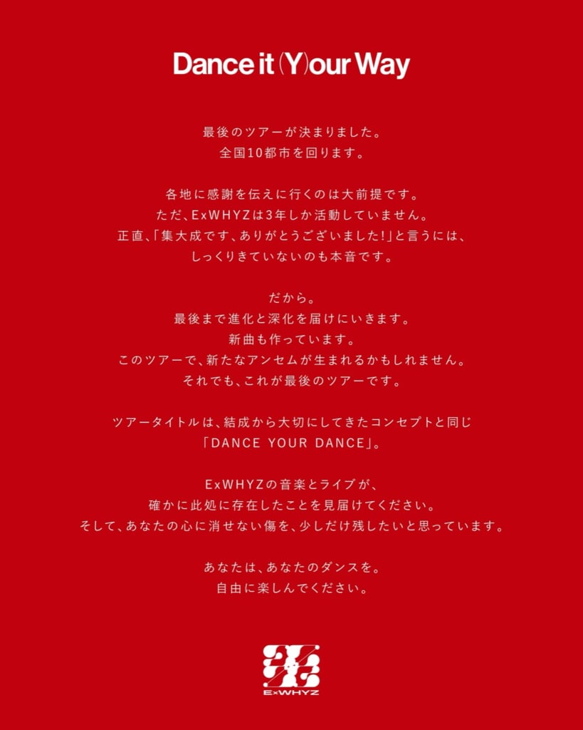 2026年での解散が決まっているExWHYZが、最後となる全国ツアー<ExWHYZ LAST TOUR ‘DANCE YOUR DANCE’>の開催を発表した。