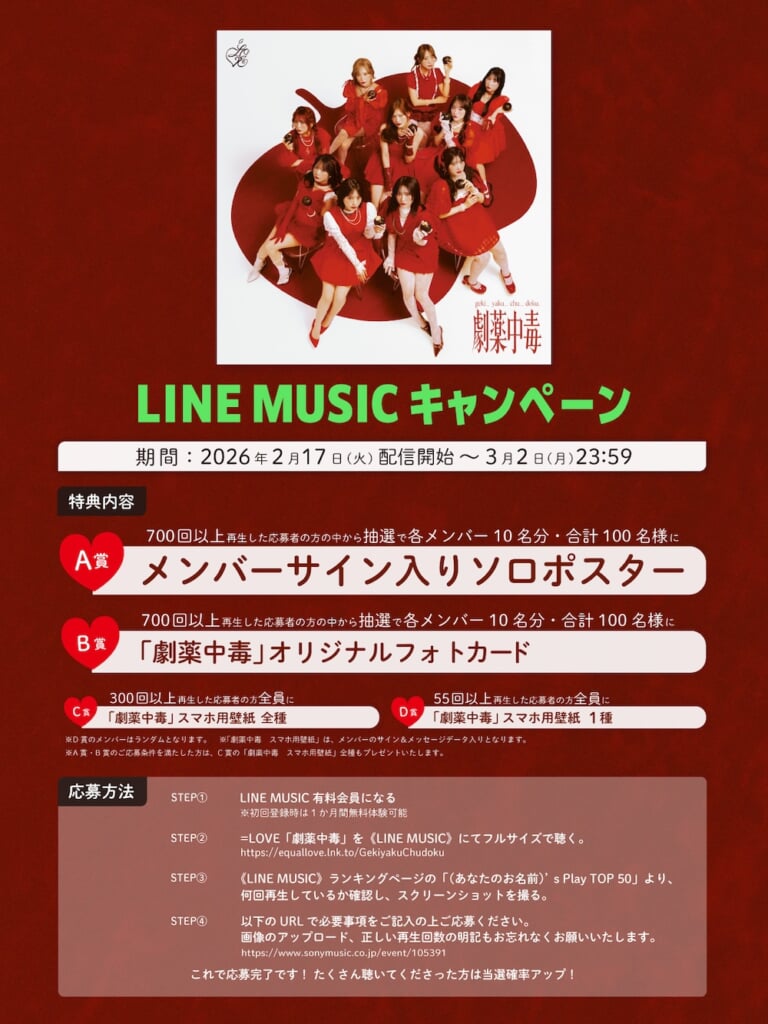 LINE MUSICで「劇薬中毒」をたくさん聴いてくださった方に、回数に応じて応募特典をプレゼント!