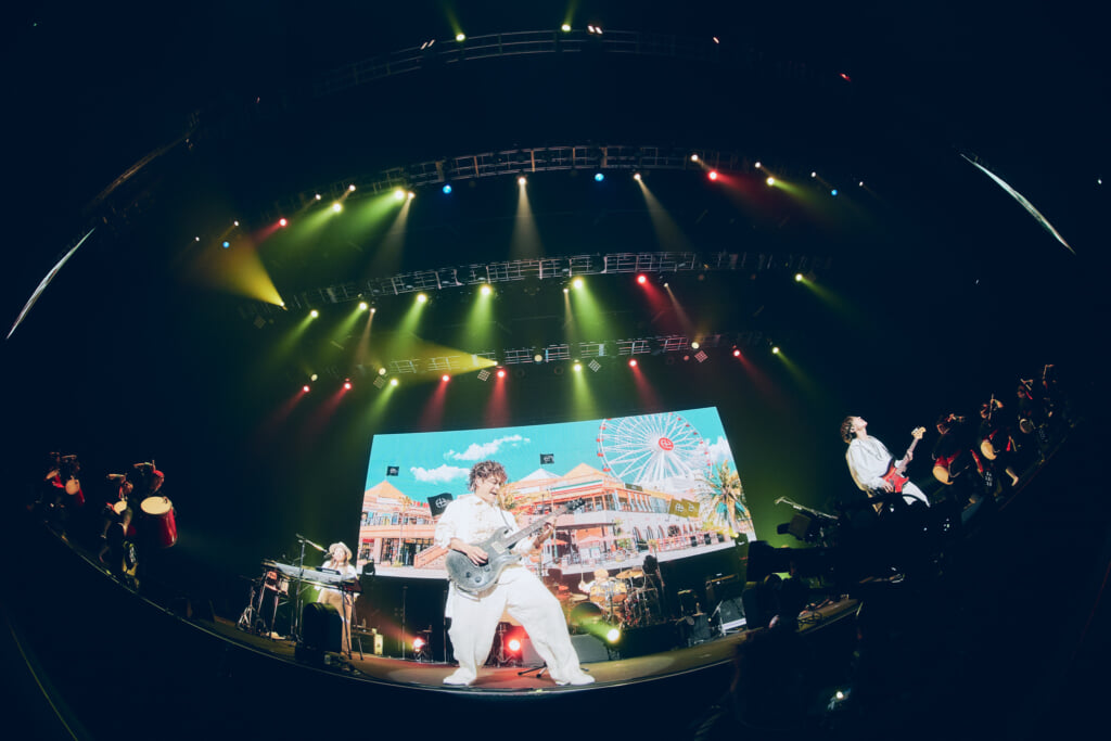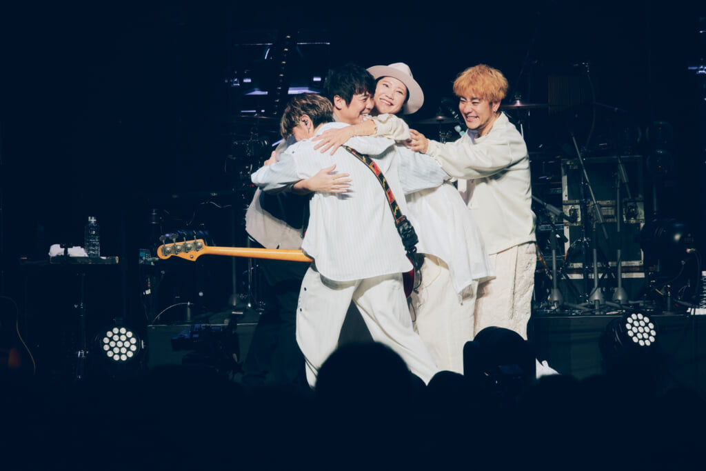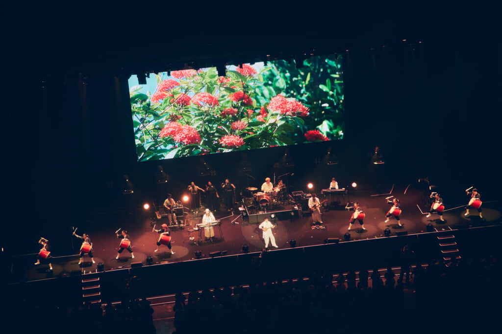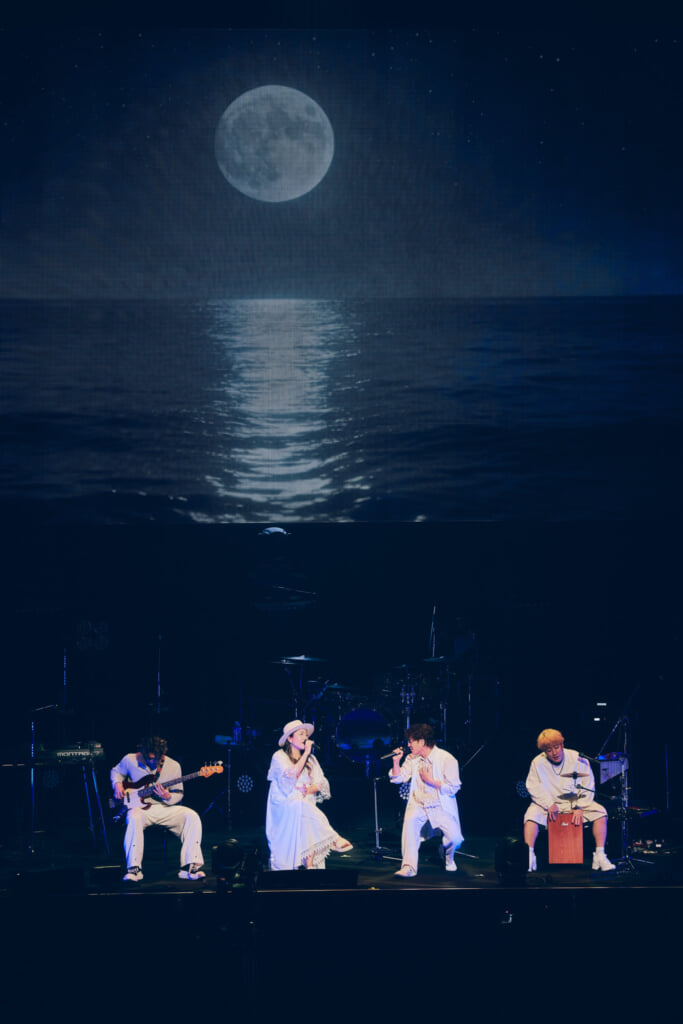 昨年の25周年ライブで行われたアコースティックセットもあった。ステージ前方にメンバーが横並びで座り、オーディエンスも着席。沖縄の満月の映像を背景にしての「いちばん近くに」。新里と仲宗根の珠玉のハーモニーが響き渡った。
