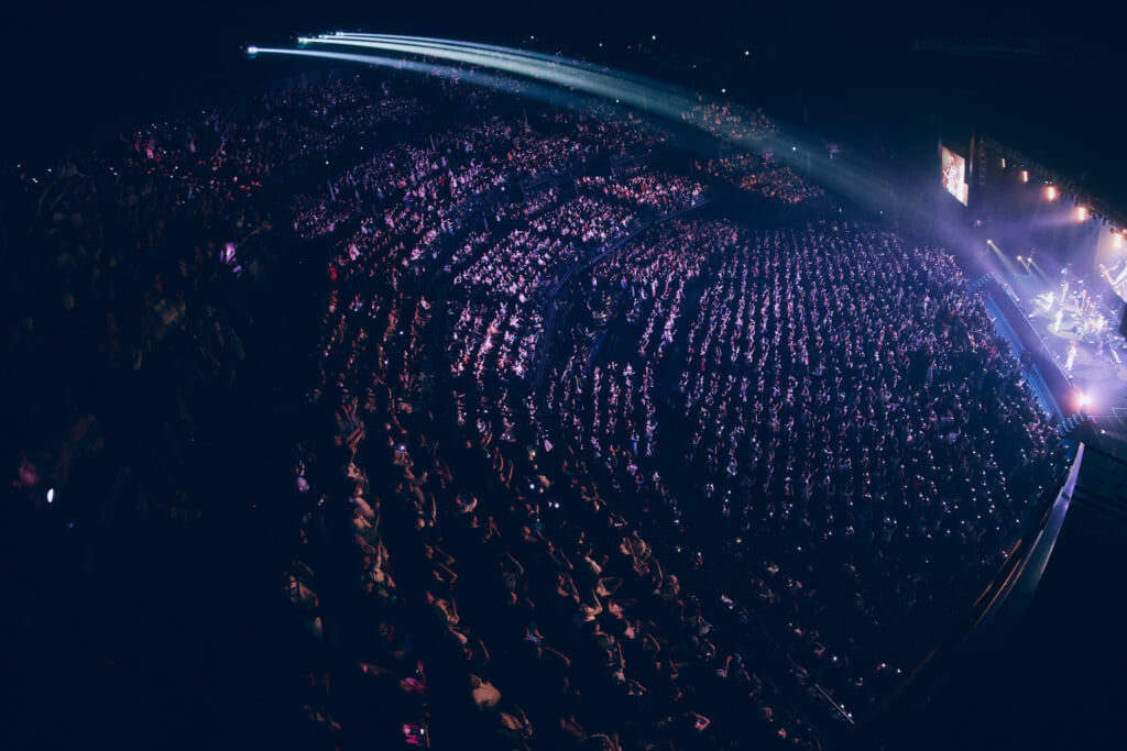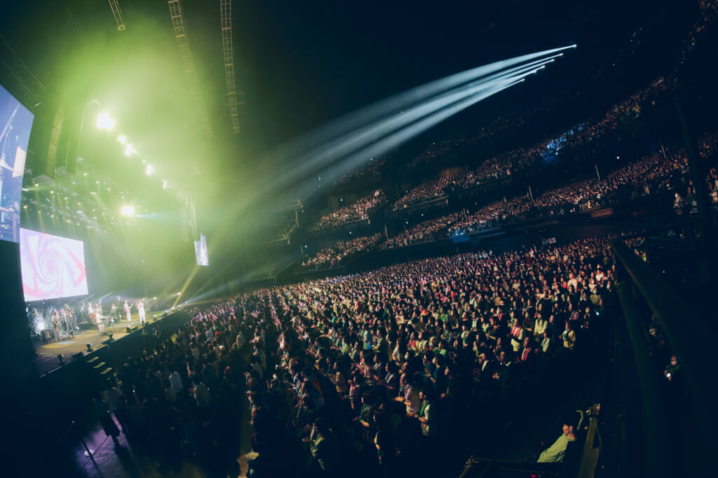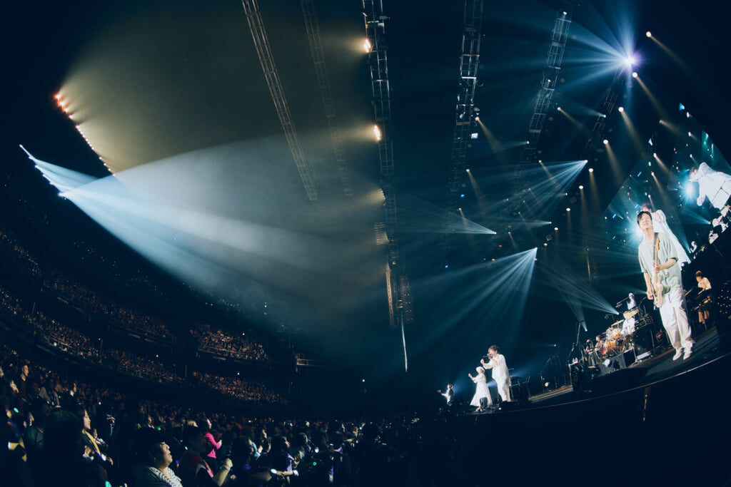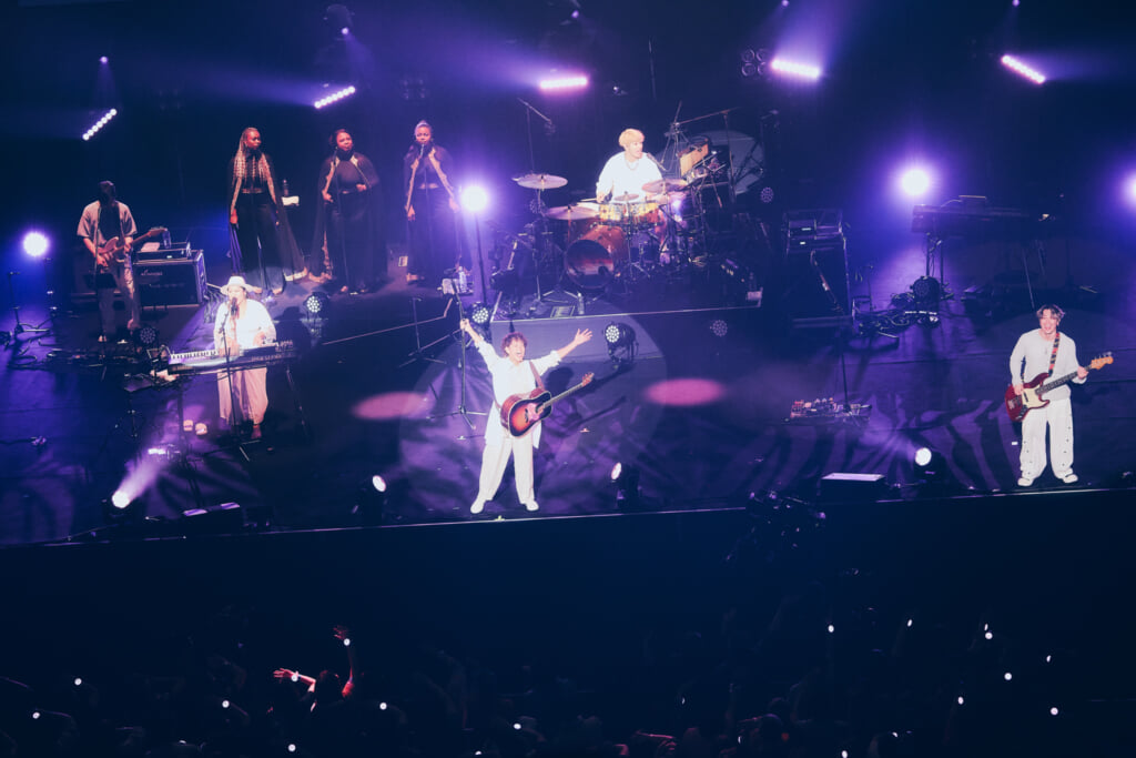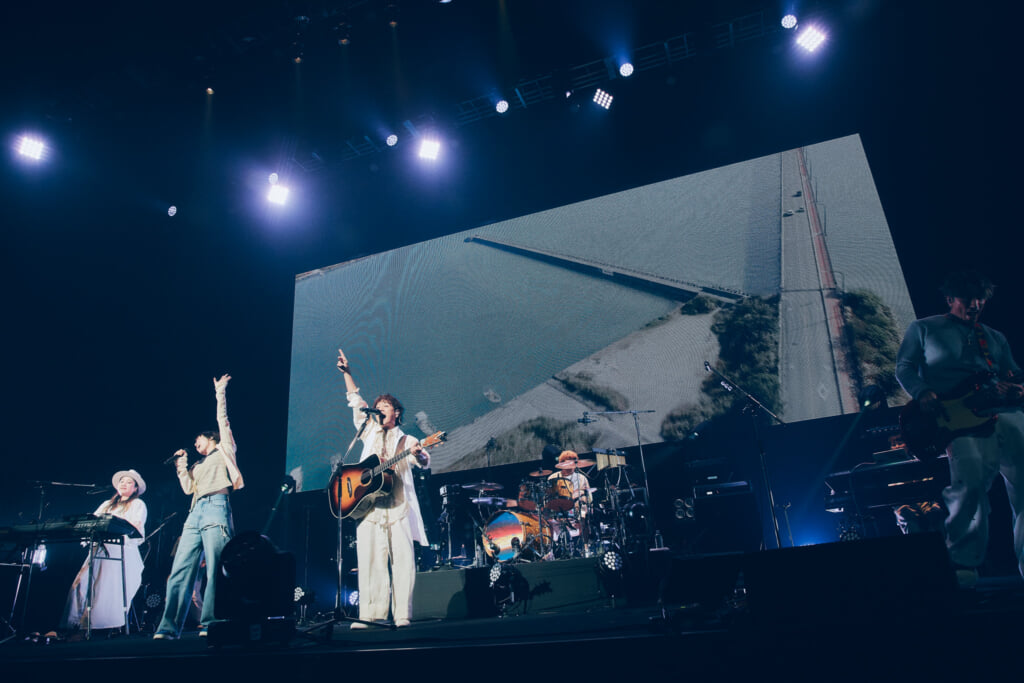 昨年の25周年ライブで行われたアコースティックセットもあった。ステージ前方にメンバーが横並びで座り、オーディエンスも着席。沖縄の満月の映像を背景にしての「いちばん近くに」。新里と仲宗根の珠玉のハーモニーが響き渡った。