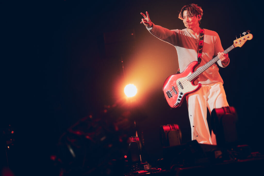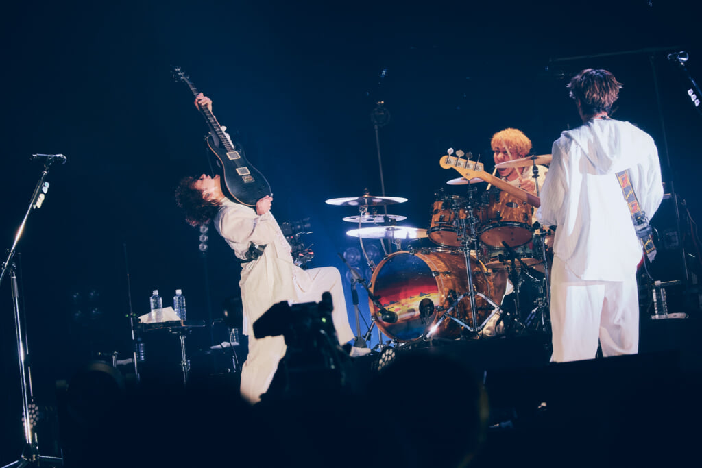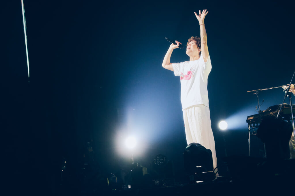 新里が「思いっきり手を伸ばして! 僕たちはこの歌からスタートしました! 感謝の気持ちを受け止めてね!」と言って演奏されたのは初のオリジナル曲であり、デビューのきっかけとなった「ホワイトビーチ」だ。メンバーもオーディエンスも楽しそうに腕を左右に振った。仲宗根がステージ中央で歌う中、新里がアリーナエリアに降りて行き、最前列のオーディエンスの手をタッチ。サビではオーディエンスが一斉にジャンプした。