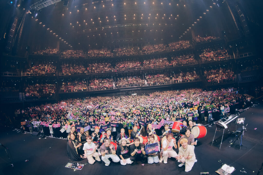 琉球國祭り太鼓が登場し、一緒に「Street Story」を披露。HYのライブではお馴染みのカチャーシー(沖縄の伝統的なダンス)と共に「イーヤサッサ!」という掛け声が響いた。約6000人がカチャーシーを踊る光景は圧巻そのもの。三線の響きと共に、琉球國祭り太鼓の華麗な演舞が展開され、仲宗根の祈りのような歌が響き渡った。
