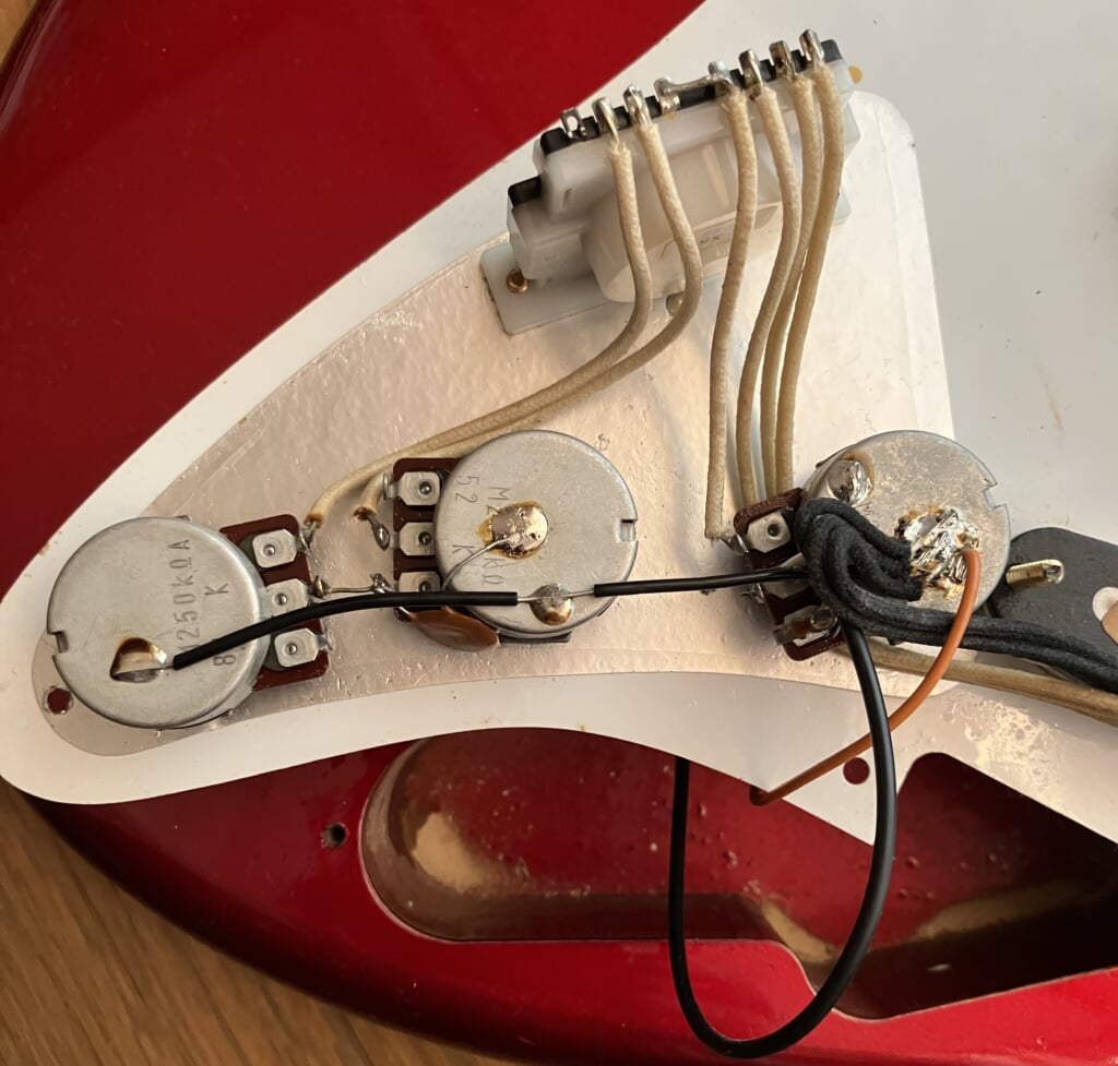 Seymour Duncan SSL-1 (1R)が付いていて、配線もしっかりしています。トレモロユニットはゴトー製です。ネットでは、色違いとか、メイプルネックとか、数本ヒットしたので、30本限定なのは本当かな、と思います。