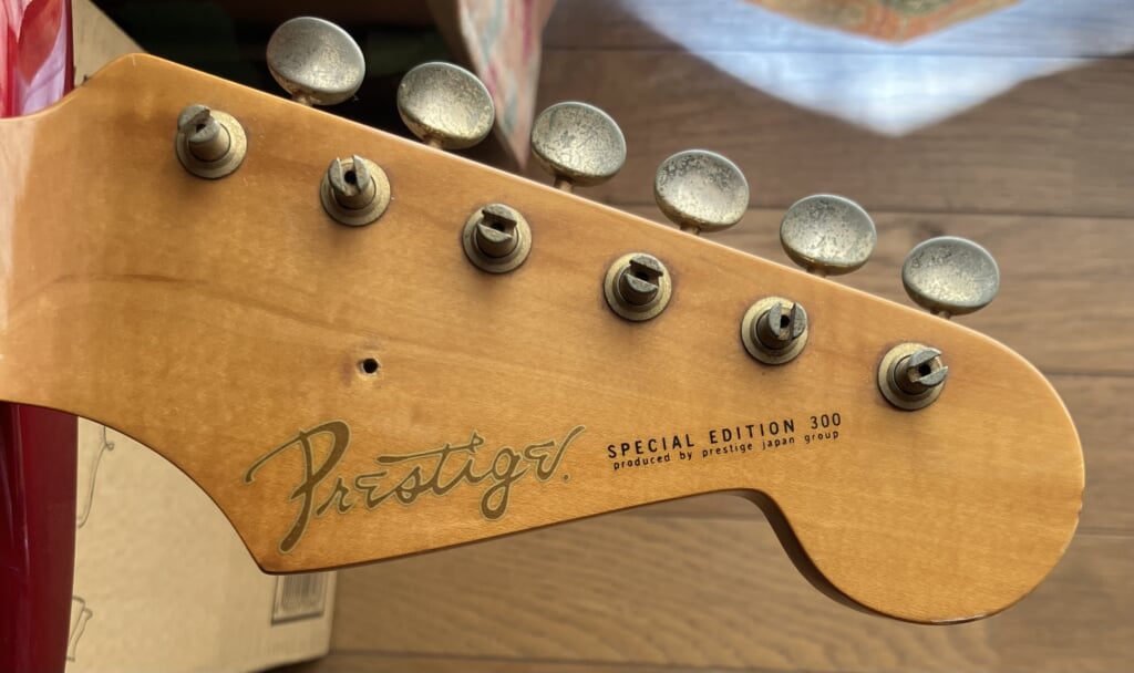 ネックにうっすらトラが入っていて、ゴールドパーツで作りも、しっかりしています。購入後、ネットで調べると、80年代後半に、プレステージ不動産という不動産業者が企画したギターで、30本限定で作成されたとのこと。有名な工房が作成したとのことで、その工房にメールで問い合わせると、全然関係ないですと少しお怒りモードでした(すいません)。