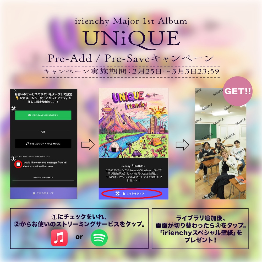 なおirienchyは、3月5日より福岡・愛知・大阪・東京の4都市を回る<irienchy Major 1st ALBUM Release TOUR 2026 “UNiQUE”>がスタートする。ツアー会場でアルバム『UNiQUE』をライブラリ追加すると、会場限定スペシャルステッカーがプレゼントされる。