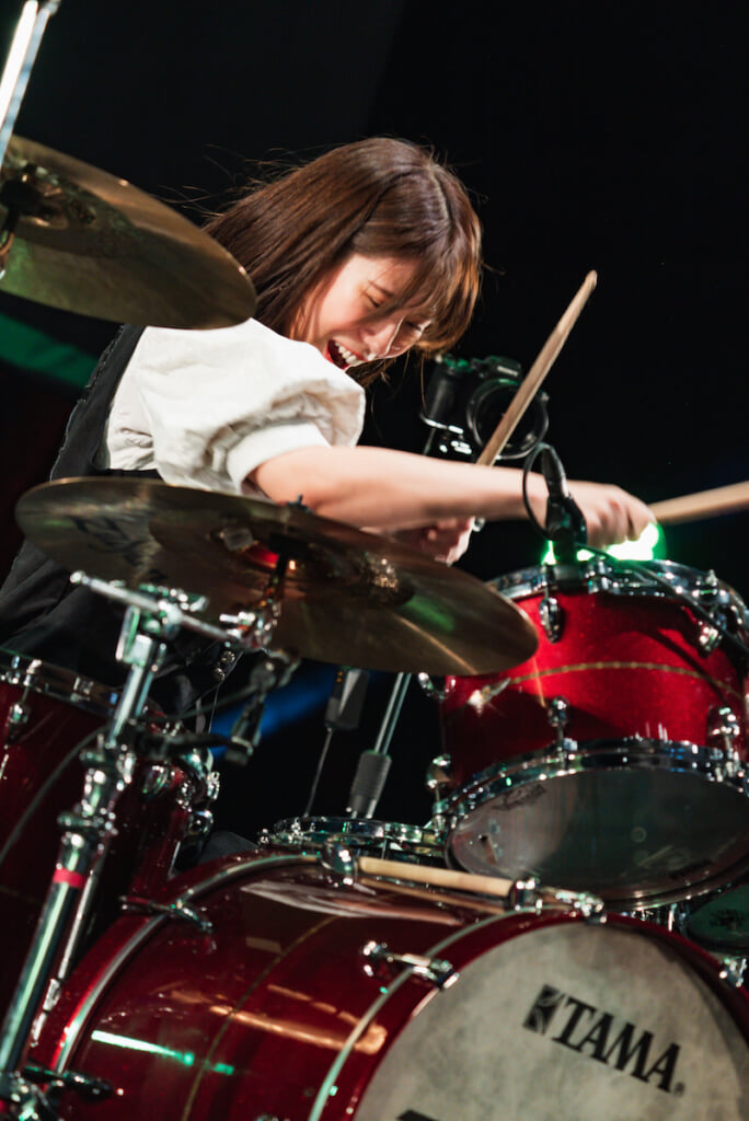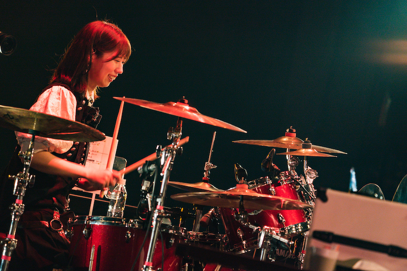 そしてそれから1年を経て実施された今回の<番外編お給仕>には“Sessions selection”というサブタイトルが伴っていた。その事実に気付いた時に歓喜の声を上げた人たちも少なくなかったことだろう。そんなことが言えるのは僕自身も思わず「おっ、そう来たか!」と言いたくなった記憶があるからだ。その言葉から想像されるのは当然ながら、これまでのお給仕で随所に盛り込まれていたさまざまなセッション・パート、楽器同士のバトルの場面がふんだんに盛り込まれた演奏プログラムである。それは前回の長尺メドレーへの挑戦以上に「バンド力」を問われるものになるはずだし、逆に言えば、この局面でそれに挑むことを決めたのは、彼女たち自身がその向上について実感できているからであるに違いない。そして実際、僕はそれを見せつけられることになったのだった。