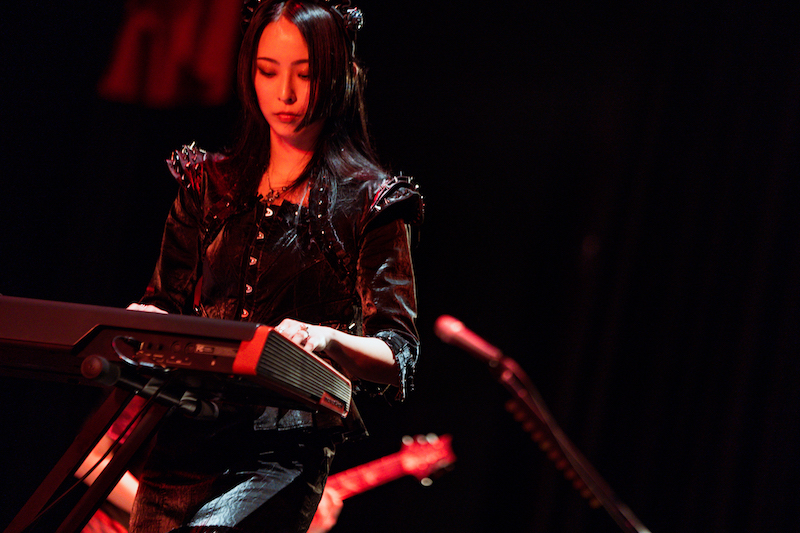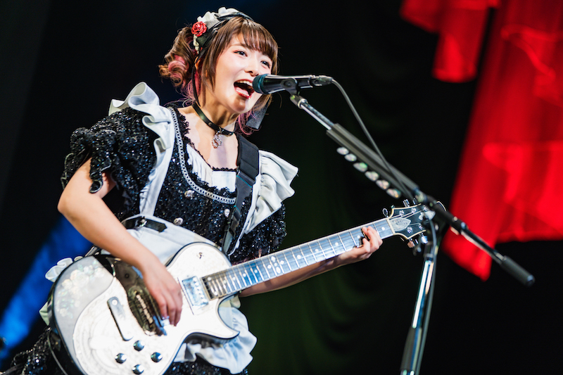 そうした流れを経ながら、3曲目には早々にインストゥルメンタル曲の「Lock and Load」が登場。従来、インスト曲が演奏される際にはSAIKIがステージ上から姿を消していたものだが、昨年10月に発売されたEP『SCOOOOOP』の最後に収められていたこの曲に、彼女はキーボードで参加している。当然ながらそれは音源上に限られたことではなく、ステージ上では5人での演奏が繰り広げられている。各曲にセッションパートが盛り込まれていることもあってか、インスト曲がお給仕序盤の快活な流れの中で浮き上がることもない。そうした流れは以降も続き、定番曲ばかりではなく久しくお給仕で耳にしていなかった楽曲についてもイントロやアウトロ、もしくは曲のなかばにセッションパートを盛り込んだ形で披露されていた。しかも多くの曲がセッションで繋がれながら繰り出され、さらにインスト曲の「without holding back」も「from now on」も登場するという、通常のお給仕ではみられない展開となった。まさに『番外編』という看板に偽りなし、である。