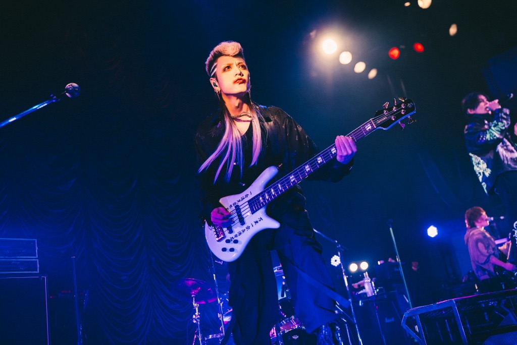 甘い暴力は楽曲の多彩さと大胆な振り幅も武器としているバンドで、ストイックさの対極にファンシーも有するが、この日は前者が強調されるメニューで構成された。ただ、そのいずれの楽曲にもタイトなプレイの中心に芯として歌がある。彼ら自身が歌モノのバンドであることを自負しているように、中盤に披露された「フェティッシュ」では艶のある咲の歌声が冴えわたった。義の操るボトムの動静が幾度も展開される文によるソロとともにドラマティックさを演出すると、咲はそこに深くエロティックなブレスを添える。それは咲、文、義の3人がこの新たな体制においても甘い暴力たる説得力を感じさせる最たる場面だったようにも思う。