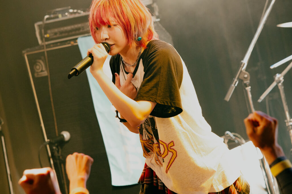 MCパートへ。ミイが「ライブ当日の3月5日が2026年で最も運気が良い日」だと告げ、そんな日にライブを開催できることの喜び、WWWに集まれたことの幸せを噛み締めると、昨年12月に正式メンバーとしてバンドに加入したドラムSORAのターンに。バンド加入への思いや今回のワンマンライブへの意気込みを笑顔で語り、客席を煽りながらそんなSORAのドラムきっかけで次のブロックへと突入。今回のライブのハイライトとも言えるような新旧の楽曲を畳みかけるブロックが始まった。