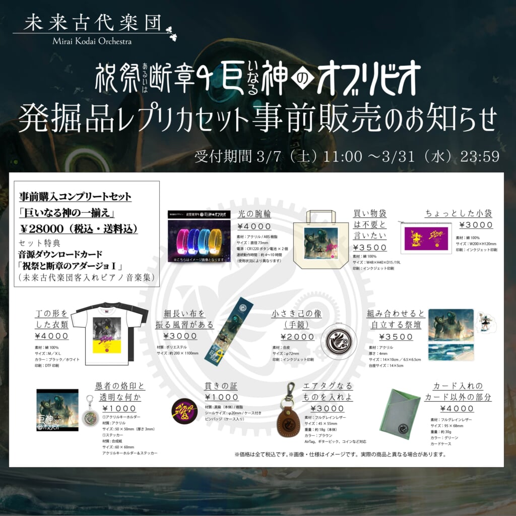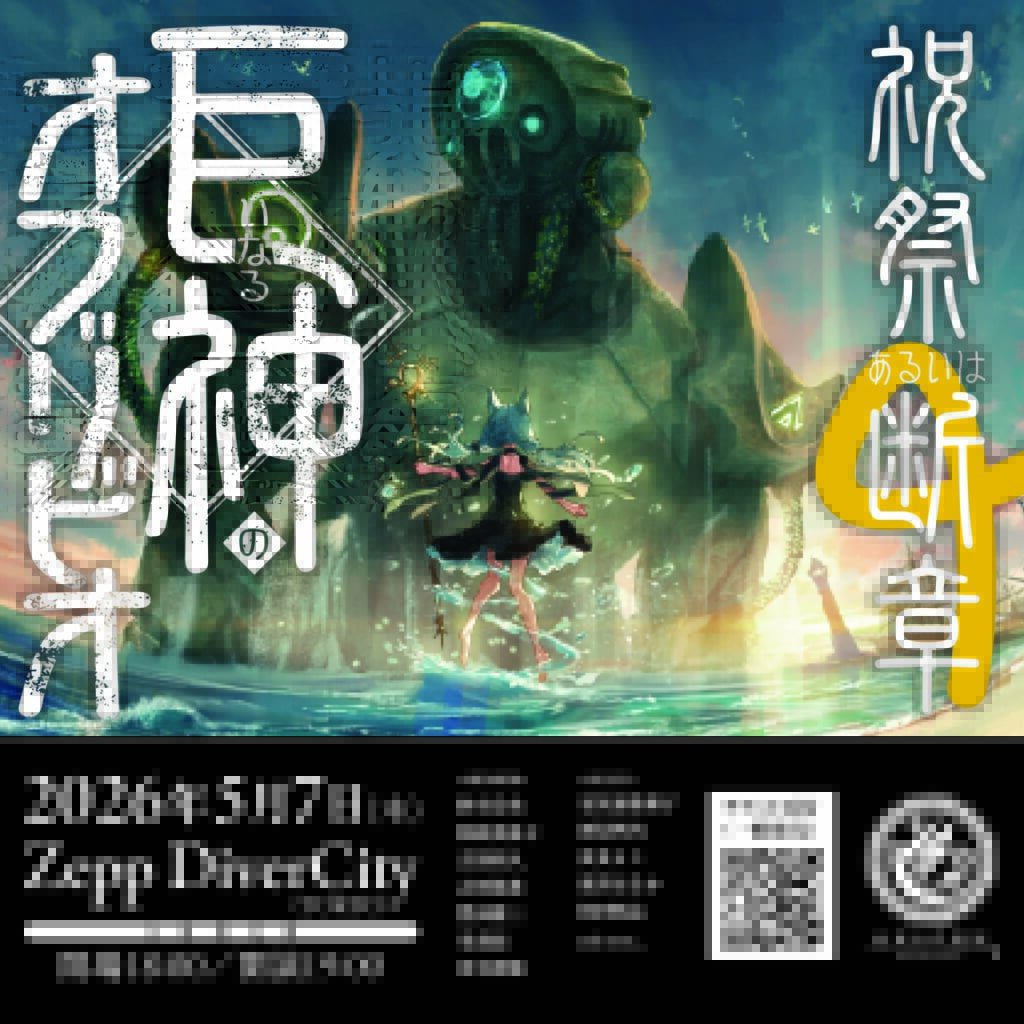 2026年5月7日(木)Zepp DiverCityにて開催される未来古代楽団のワンマン公演<祝祭あるいは断章6『巨いなる神のオブリビオ(おおいなるかみのおぶりびお)』>のチケット一般発売がスタートとなり、あわせて公式グッズ全11種の先行事前販売も実施となった。