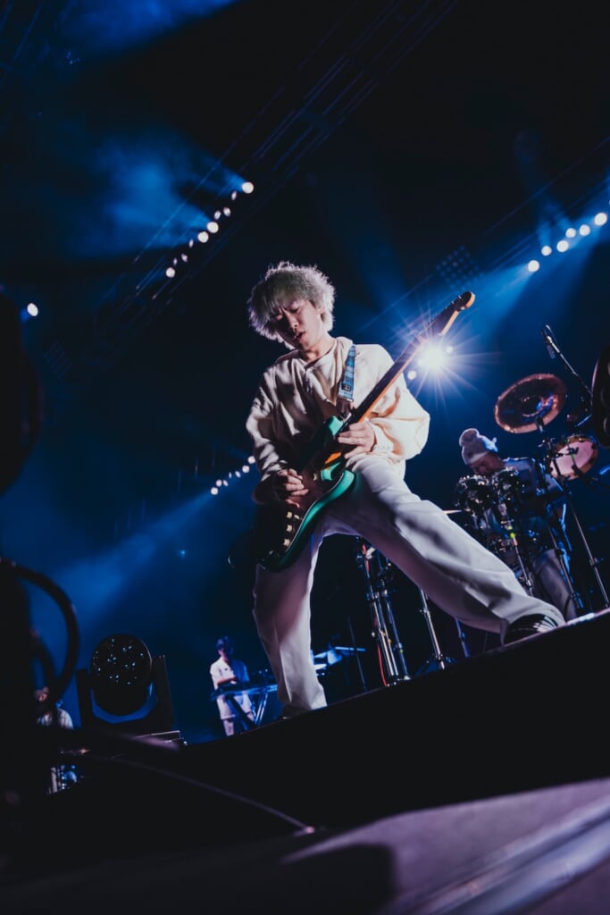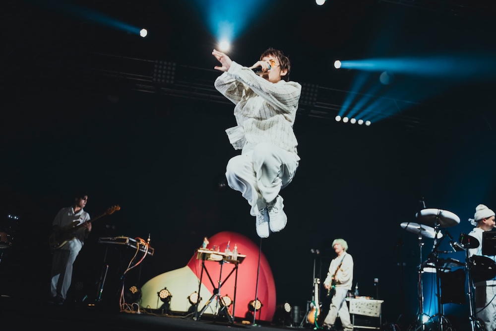 ライブ中盤、 TikTokをきっかけに支持を集めた、総再生回数11億回を超える楽曲「Burning Friday Night」のメロディが流れはじめ、イントロから大合唱が巻き起こる。ステージ中央で松崎(G)と山浦(B)が背中合わせに演奏するシーンでは、ガーデンシアターが揺れるほどフロアにいる全員が飛び跳ねる光景も。さらに、来たる春にほのかな期待を寄せる楽曲「春はもうすぐ そこ」から「エモめの夏」「KIDS」「越冬」と、まるで春夏秋冬の移ろいを表すかのような曲順でオーティエンスを魅了していく。「MOONLIGHT」では心地よいメロウなグルーヴで会場を包み込み、柴田(Dr)とラミ(Per)の攻撃的なビートからはじまるライブならではのアレンジが加えられた「はるか吠える」や「フラワー」も披露。そして、熊木と大瀧との間で、新たな命を授かったからこそ生まれた最新曲「Baby, world is yours」を演奏するなど、見るものを全く飽きさせない多彩な音楽性を提示しながらライブは進んでいった。