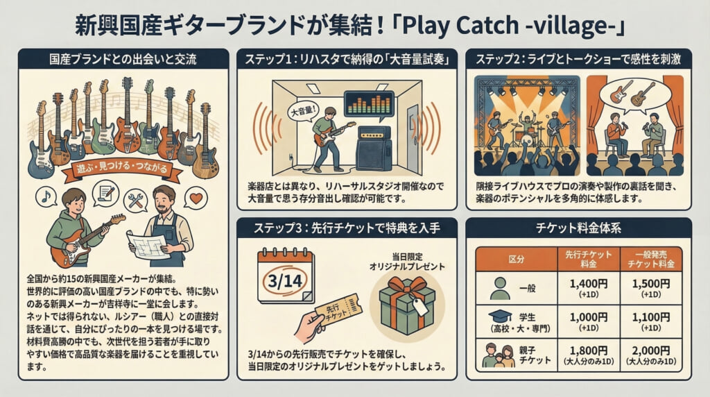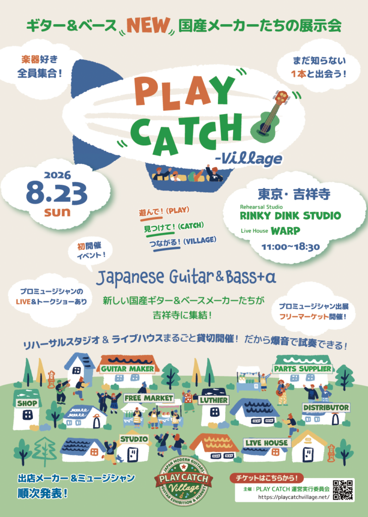 全国から新興国産ギター&ベースメーカーが集まる新しい展示会&ライブイベント<Play Catch -village->が、2026年8月23日に東京吉祥寺にて開催される。世界的にも高い評価を受けている日本の国産ギターだが、なかでも新興国産ギターメーカーにスポットを当て、楽器とメーカーとプレイヤーが「遊ぶ・見つける・つながる」ことを念頭に置いて企画・立案されたイベントだ。