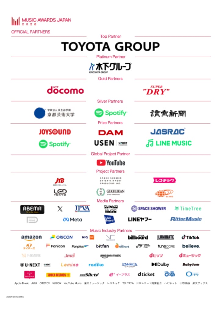 そしてこのたび、一般リスナーの皆様も投票に参加可能な一般投票部門・共創カテゴリーの詳細が発表となった。『MUSIC AWARDS JAPAN 2026』ではスポティファイジャパン株式会社、株式会社エクシング、株式会社第一興商、株式会社MIXI、株式会社USEN(U-NEXT.HD)、LINE MUSIC株式会社がパートナーとなり、全7部門で一般参加部門を展開する予定だ。