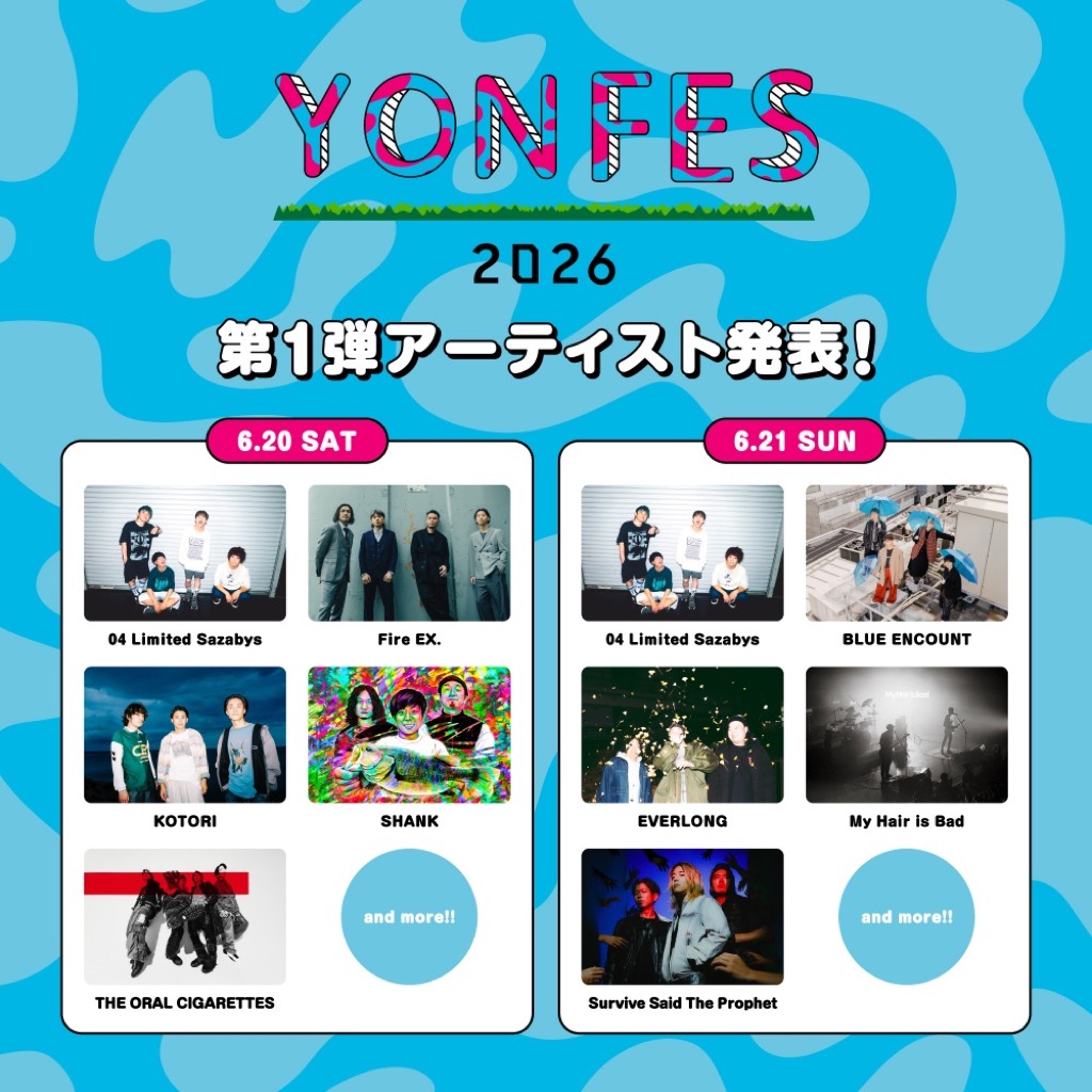 チケット受付は本日より〈YON FES 2026〉オフィシャルHP先行がスタート。応募期間は3/16(月)21:00~3/22(日)23:59となる。詳細は<YON FES 2026>特設サイトにて。