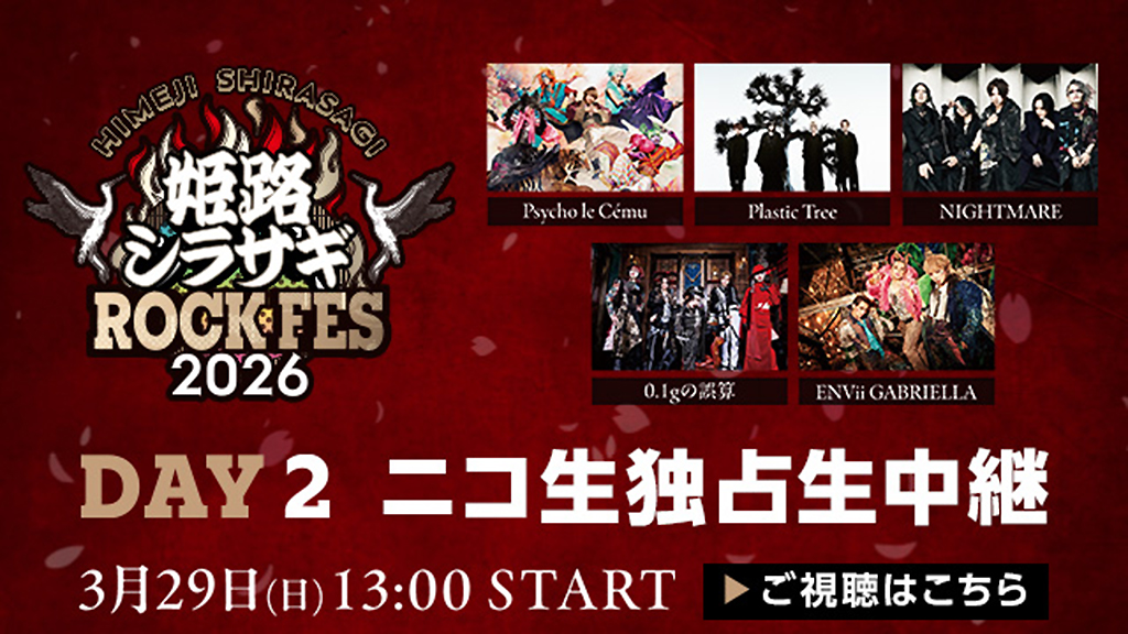 『ニコ生独占生中継「姫路シラサギROCK FES 2026(DAY2)」』では、Psycho le Cému、NIGHTMARE、Plastic Tree、0.1gの誤算、ENVii GABRIELLAといった全出演バンドのアクトが放送される予定だ。詳細はオフィシャルサイトにて。