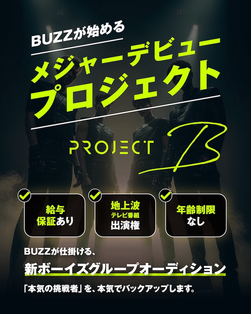 BUZZは、日本一の店舗数を誇るレンタルスタジオを展開する企業として知られている。今回始動したPROJECT Bでは、スタジオに加え、ライブハウス、レコーディングルーム、撮影スタジオ、トレーニング施設など、アーティスト活動を支える環境を活用した育成を行う。